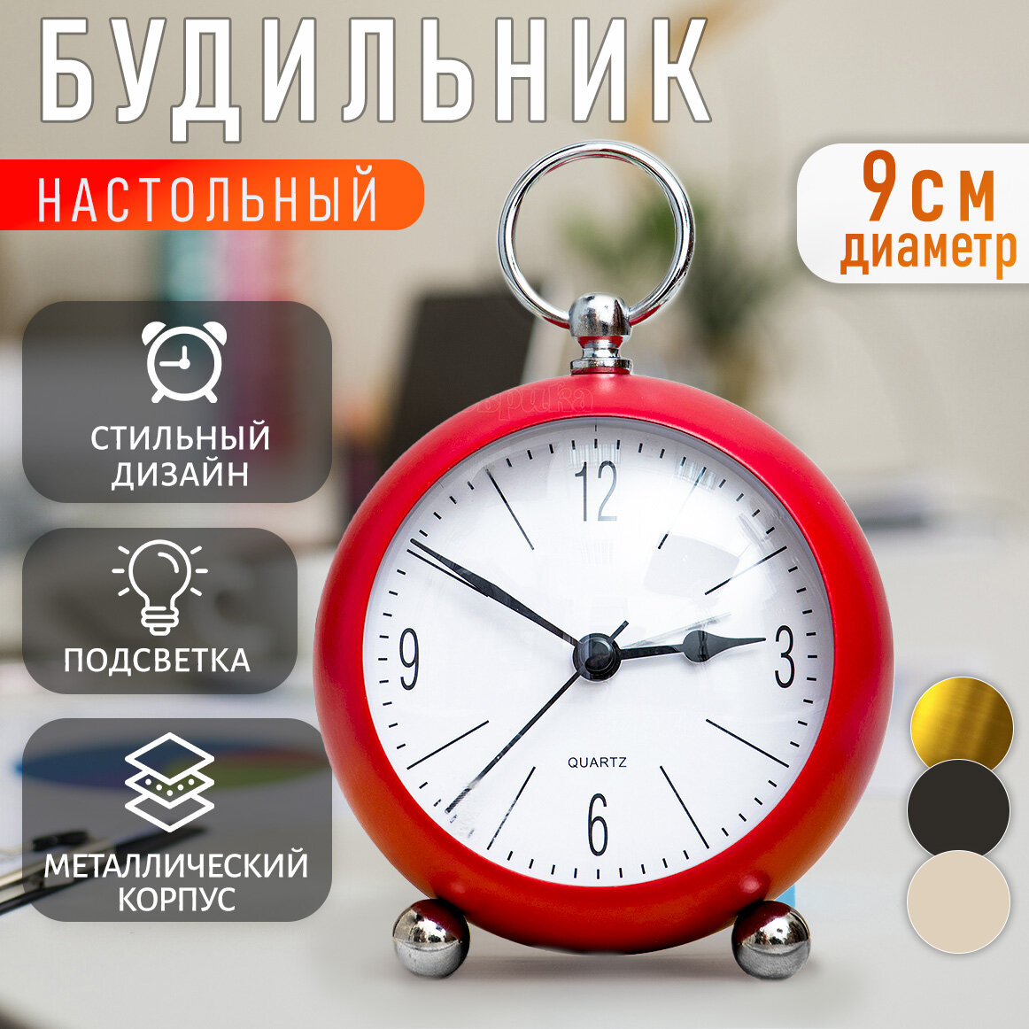 Часы будильник настольные D-7 см красный цвет / подарок мужчине на 23 февраля, женщине на 8 марта, ребенку, мальчику, сыну, девочке, дочке