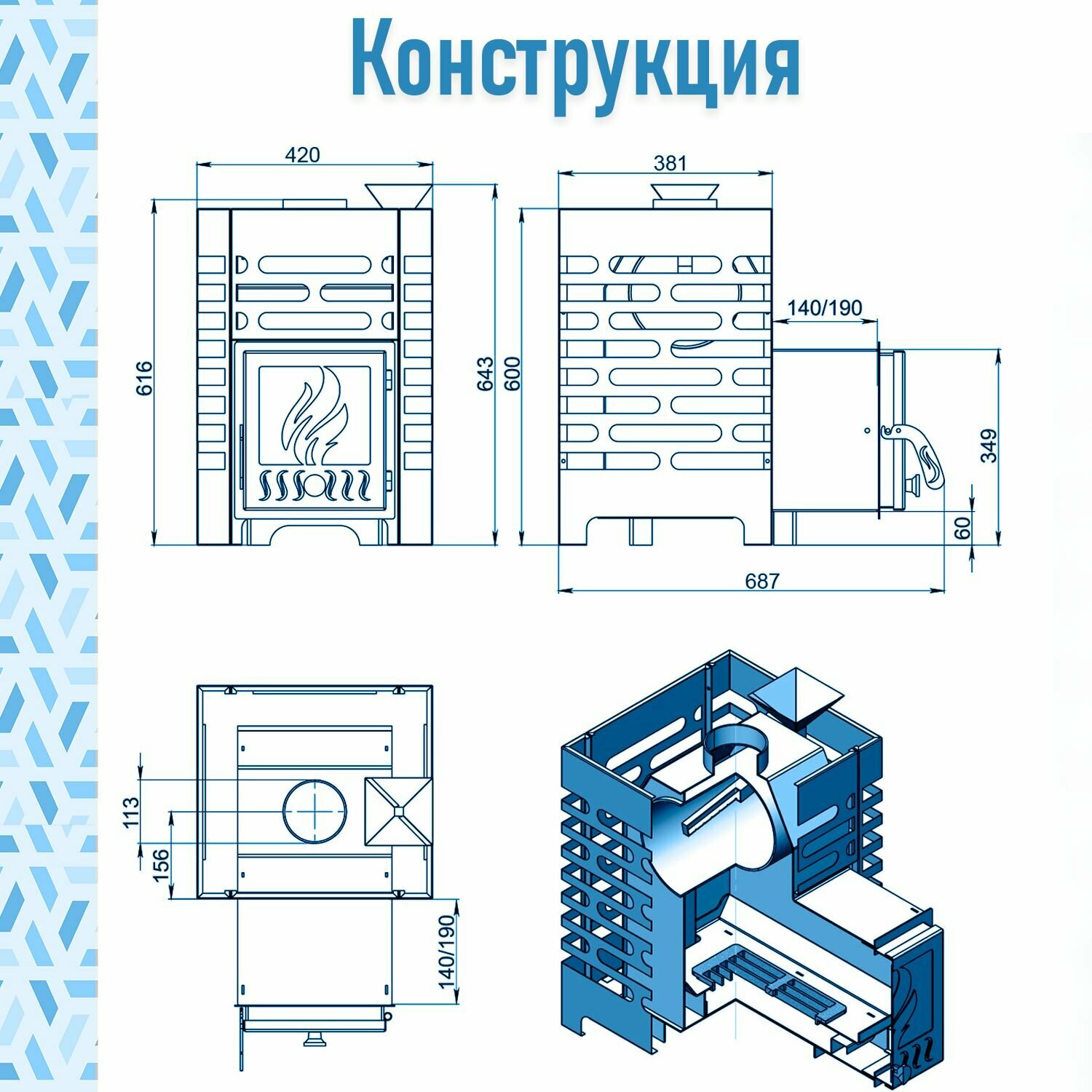 | Минусы: | Написано что печь рассчитана на 14 кубов, по факту дай бог натопит 5. Никому не советую, топка маленькая( можно только палочки мелкие по 20см класть иначе не влезут( |