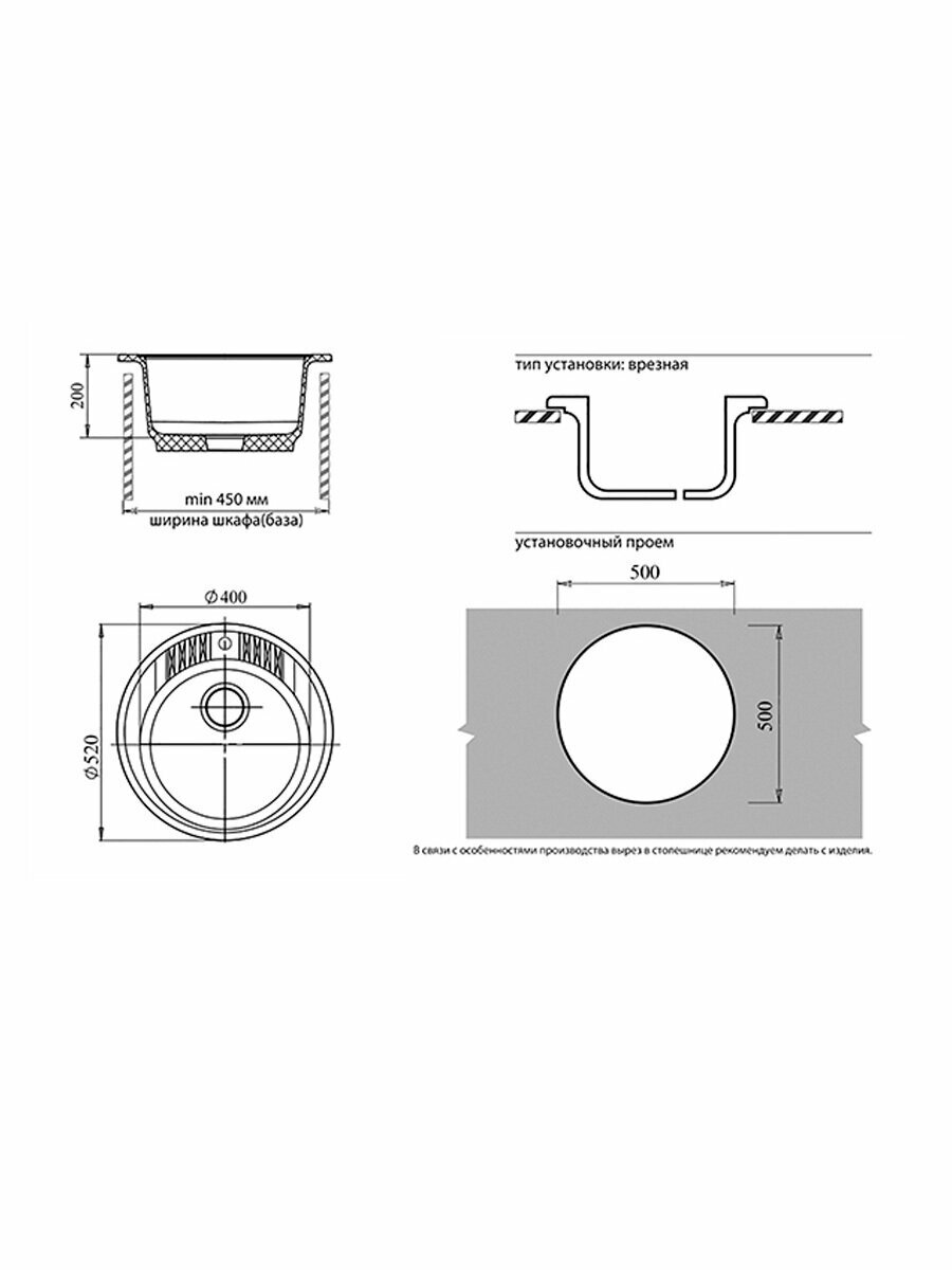 Кухонная мраморная мойка GranFest RONDO GF-R520 (GF-52), круглая, врезная, D-520мм, с переливом, цвет черный/Раковина для кухни