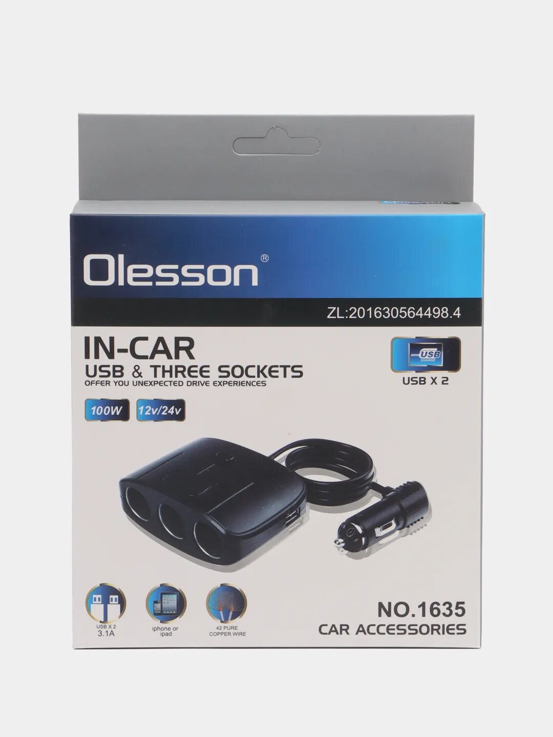 Разветвитель прикуривателя Olesson 1635, на 3 прикуривателя 2 USB выхода 800mAh с кабелем 1.2м