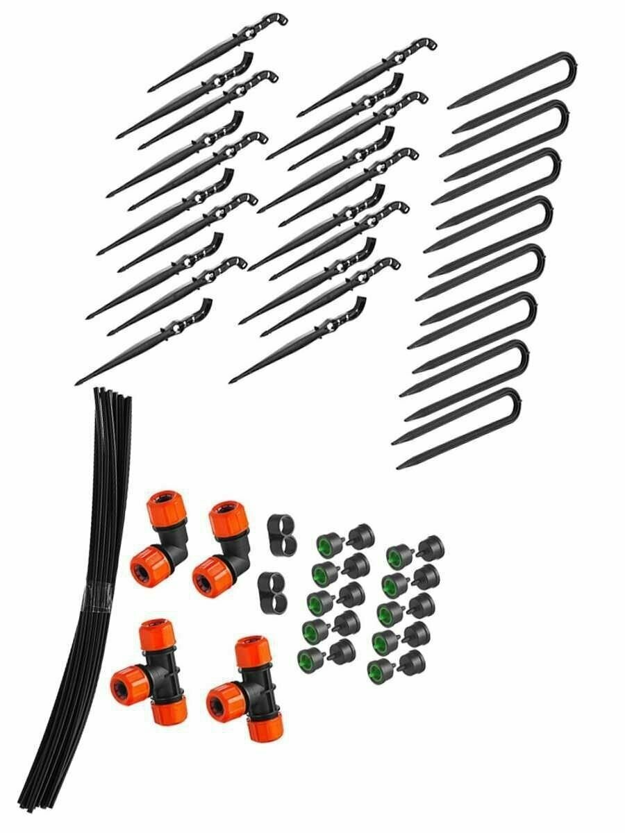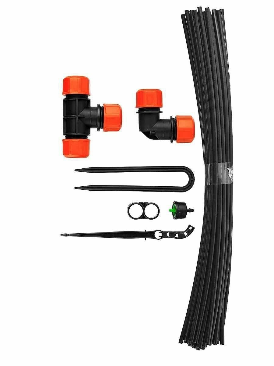 | Комплектация | микротрубка - 20 шт, стрелка с зажимом - 20 шт, цанговый тройник 1/2" - 2 шт, зажим для магистрального шланга - 2 шт, цанговый уголок 1/2" - 2 шт, компенсированная капельница - 20 шт, прижим для магистрального шланга - 8 шт |