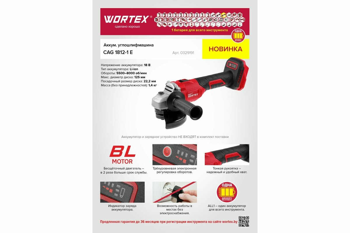 Аккум. углошлифмашина WORTEX LX CAG 1812-1 E в кор. ALL1 SOLO бесщет., 18 В, 125 мм, 8000 об/мин (рег. об.) (0329191)