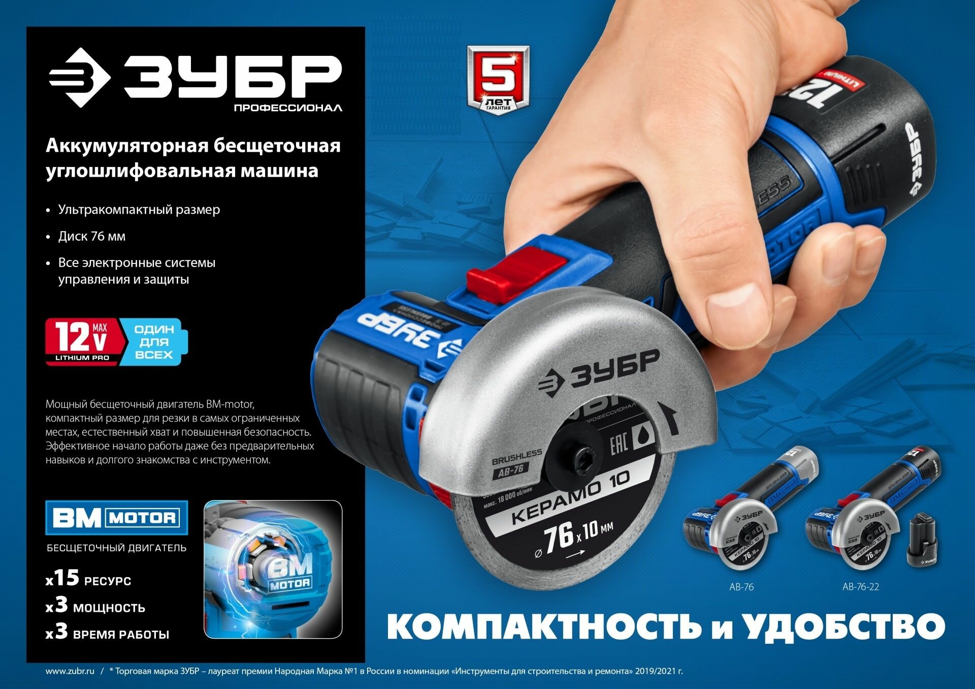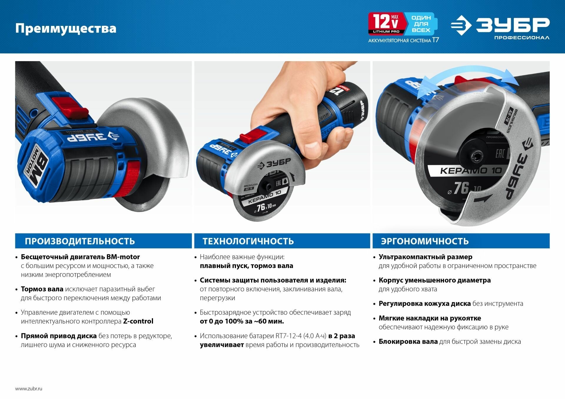 СохранитьЗУБР Т7, 12 В, d76 мм, без АКБ, бесщеточная УШМ, Профессионал (AB-76) интересное: