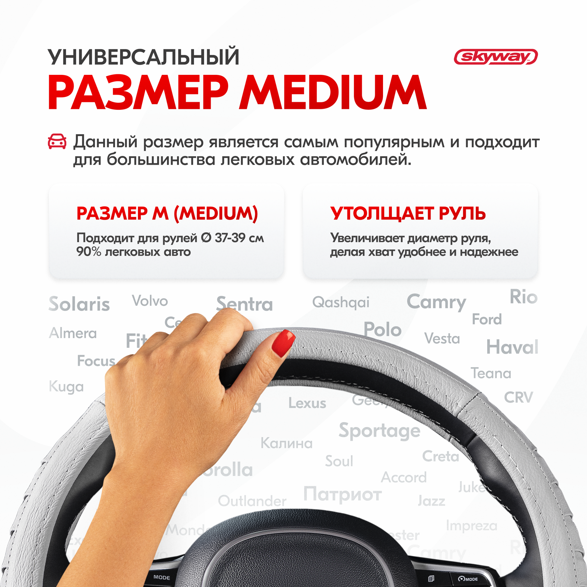 СохранитьSKYWAY S01108009 Оплетка на руль Real-5 нат.кожа, Серая M; SKYWAY интересное:
