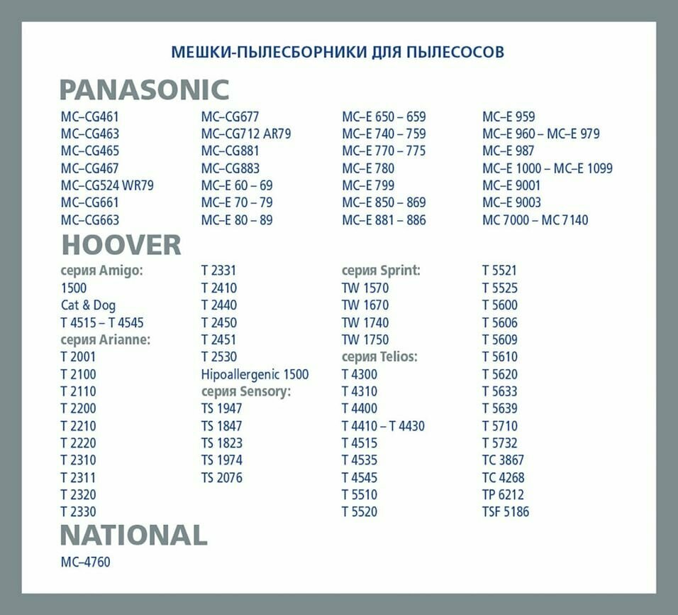 | Производитель совместимого пылесоса | Hoover, Panasonic |