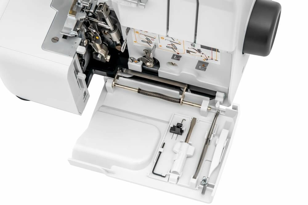 | Дополнительные функции | автоматическая заправка иглы, дифференциальная подача, заправщик нижнего петлителя, отключение ножа, регулировка прижима ткани, регулировка ширины обреза ткани |