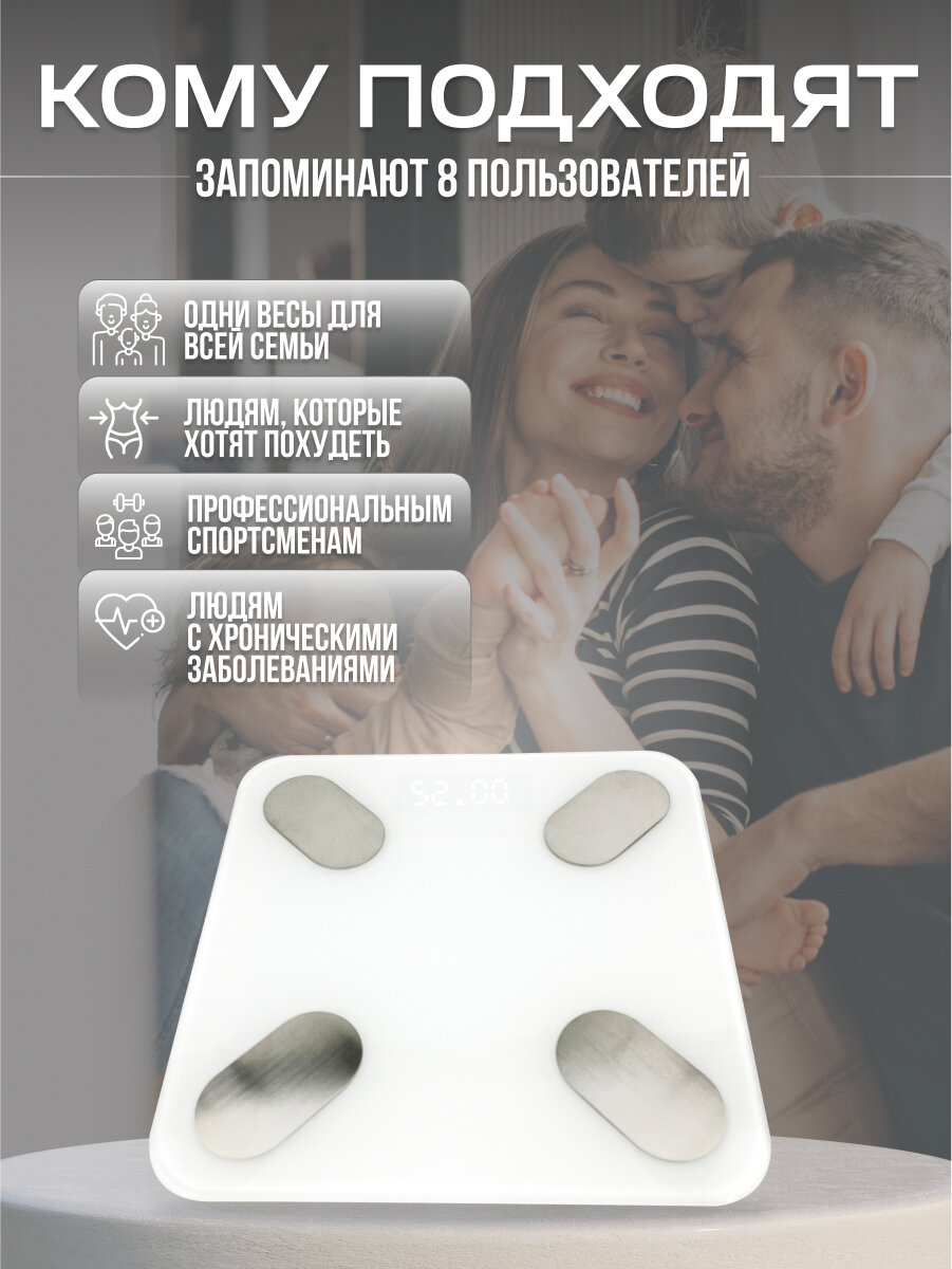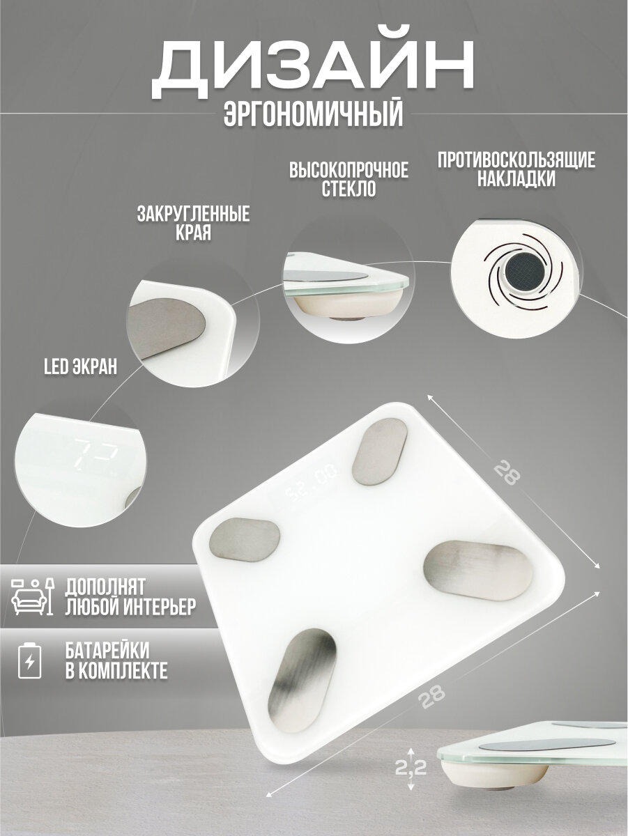Умные весы напольные ДОМ ХИТ, синхронизация по Bluetooth, функций здоровья, высокая точность, компактный, белые