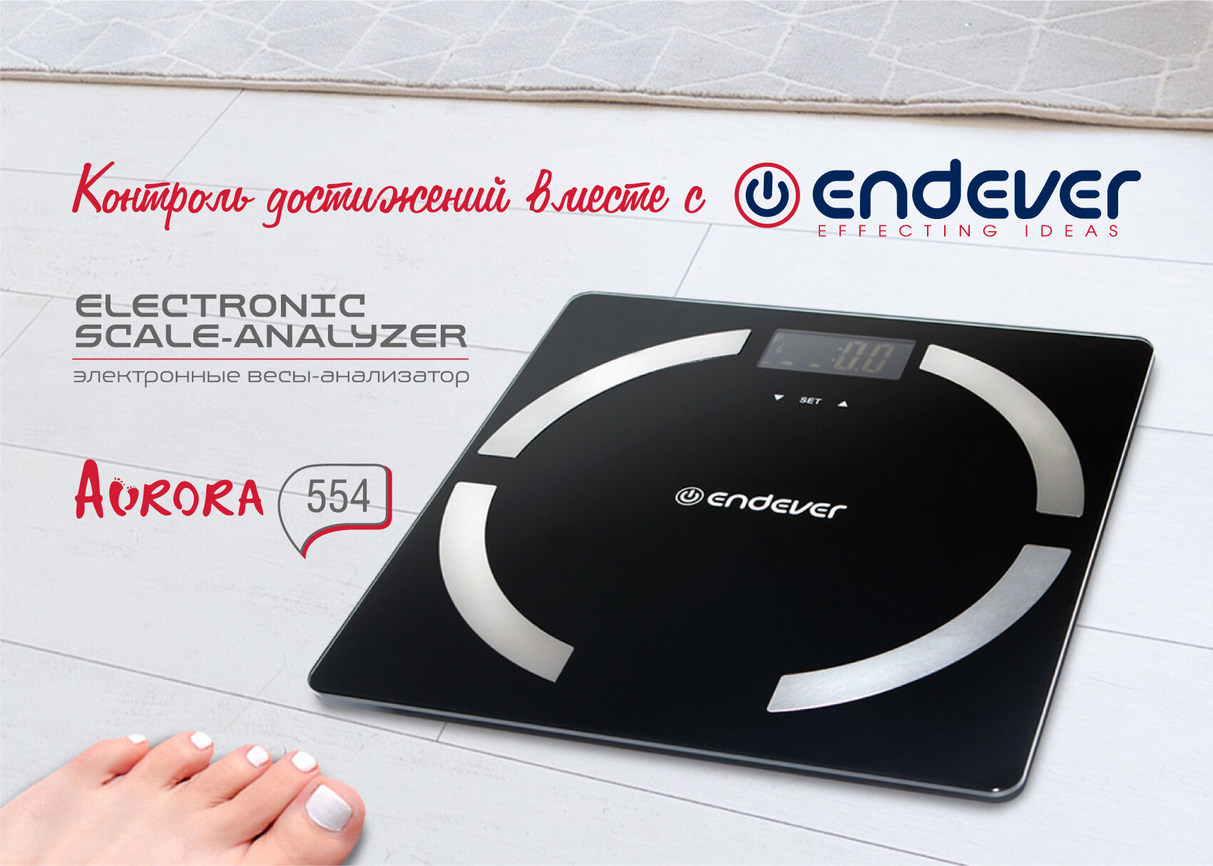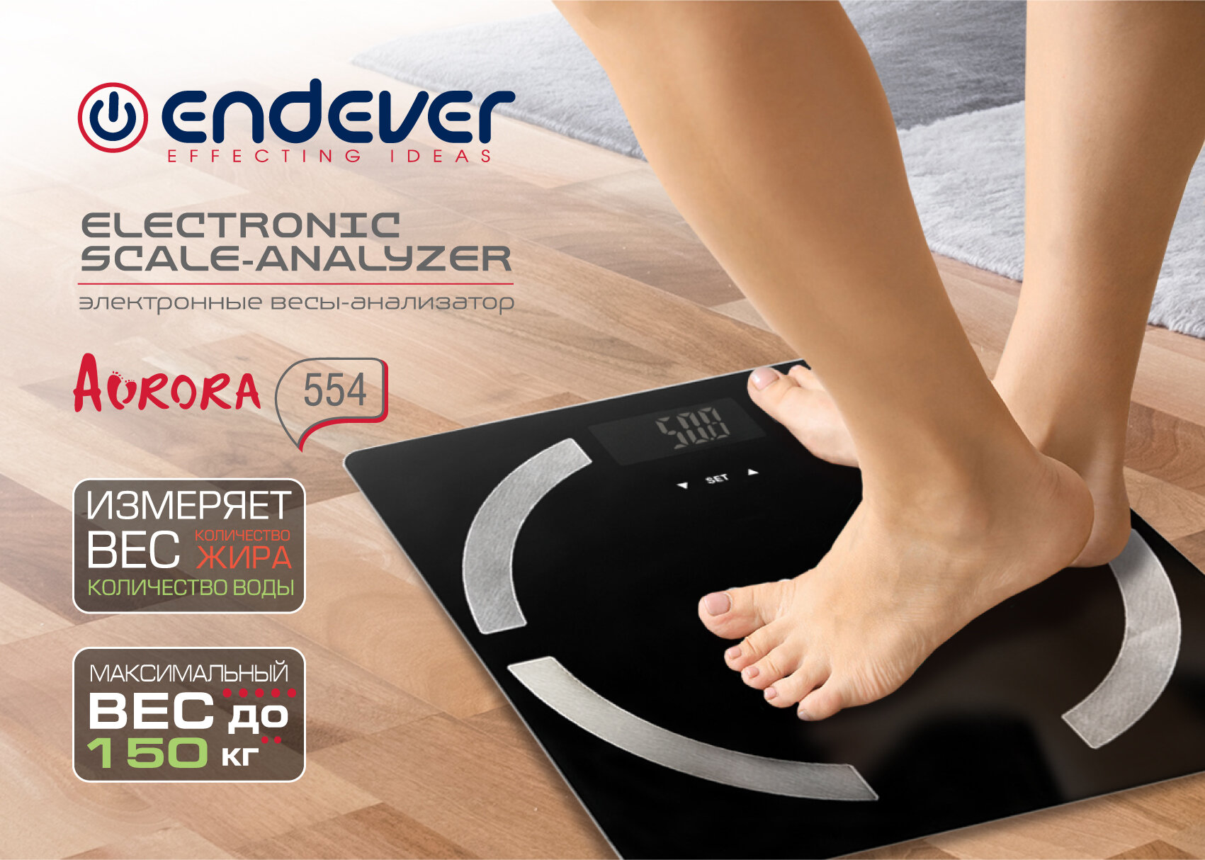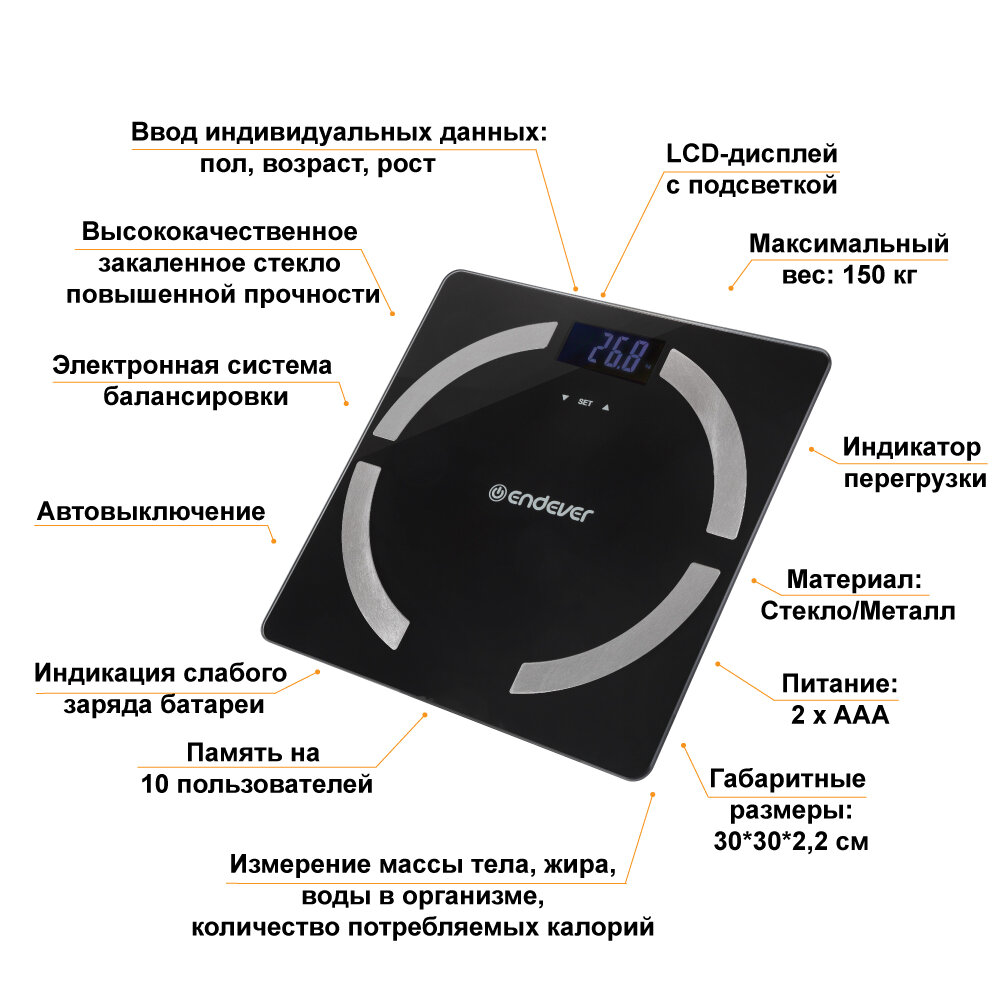 Напольные весы-анализатор Endever Aurora-554 / вес, жир, вода / закаленное стекло / до 150 кг