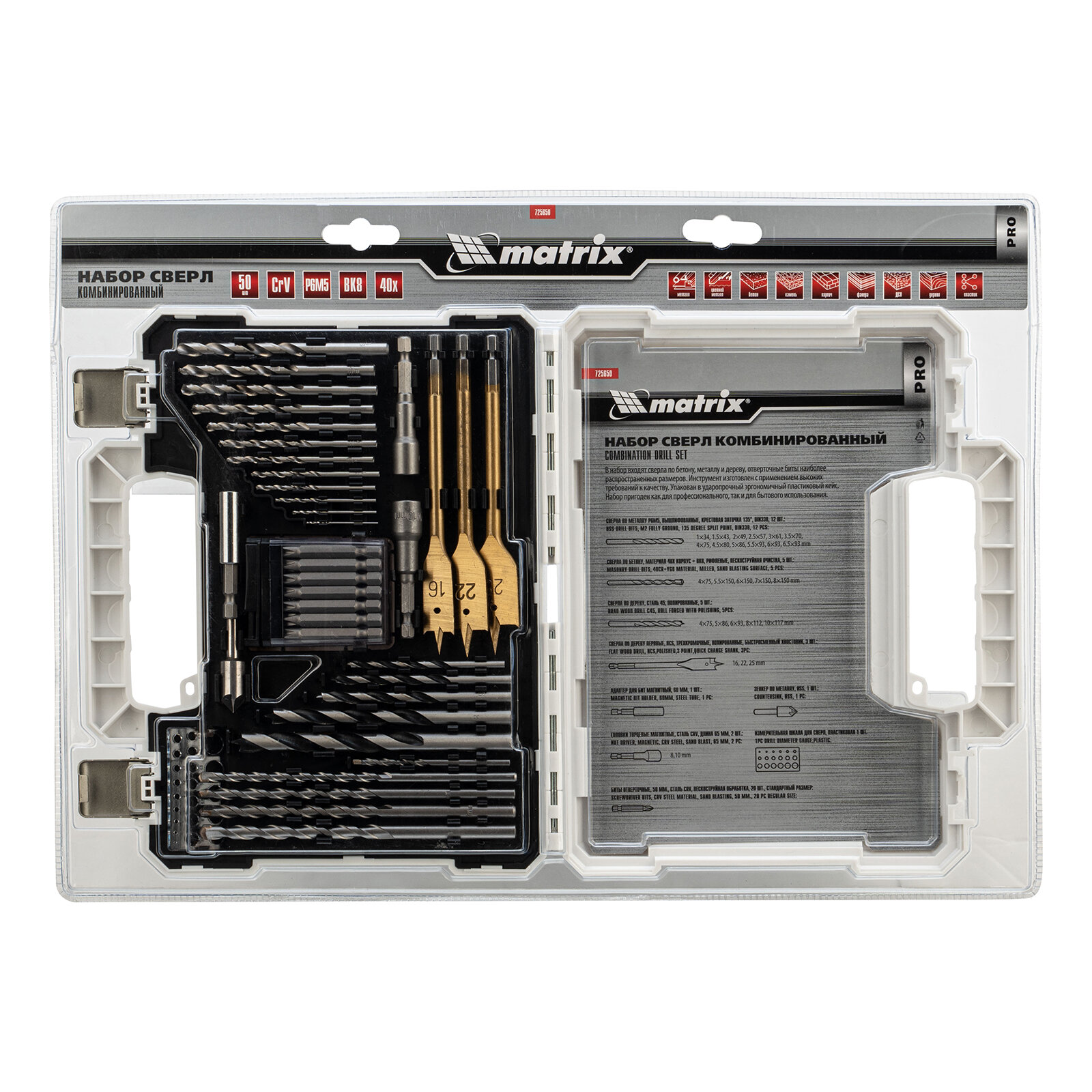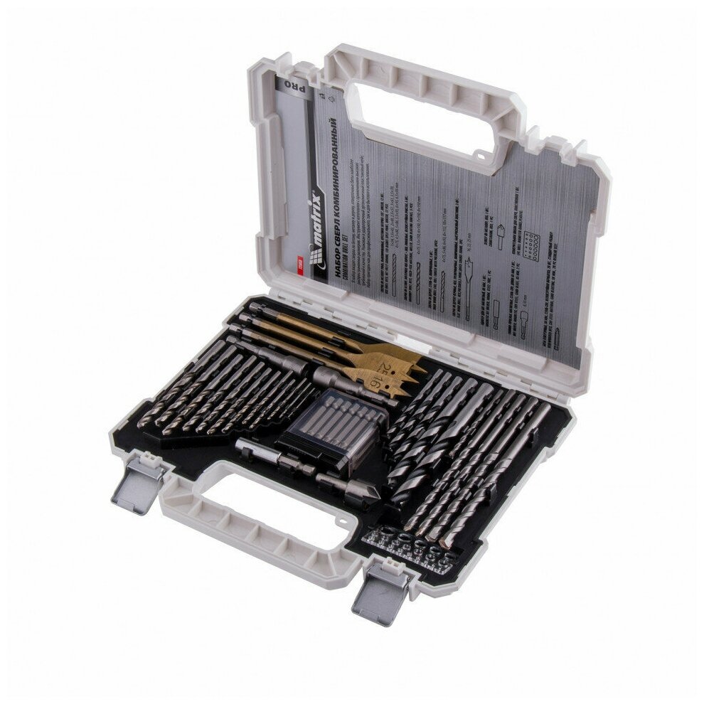 Купить Набор сверл комб.,мет.1-6,5мм,бет.4-8мм,дер.4-10мм,перк, бит.20шт,адап,гол.2шт,зенк,50пр.// Matrix