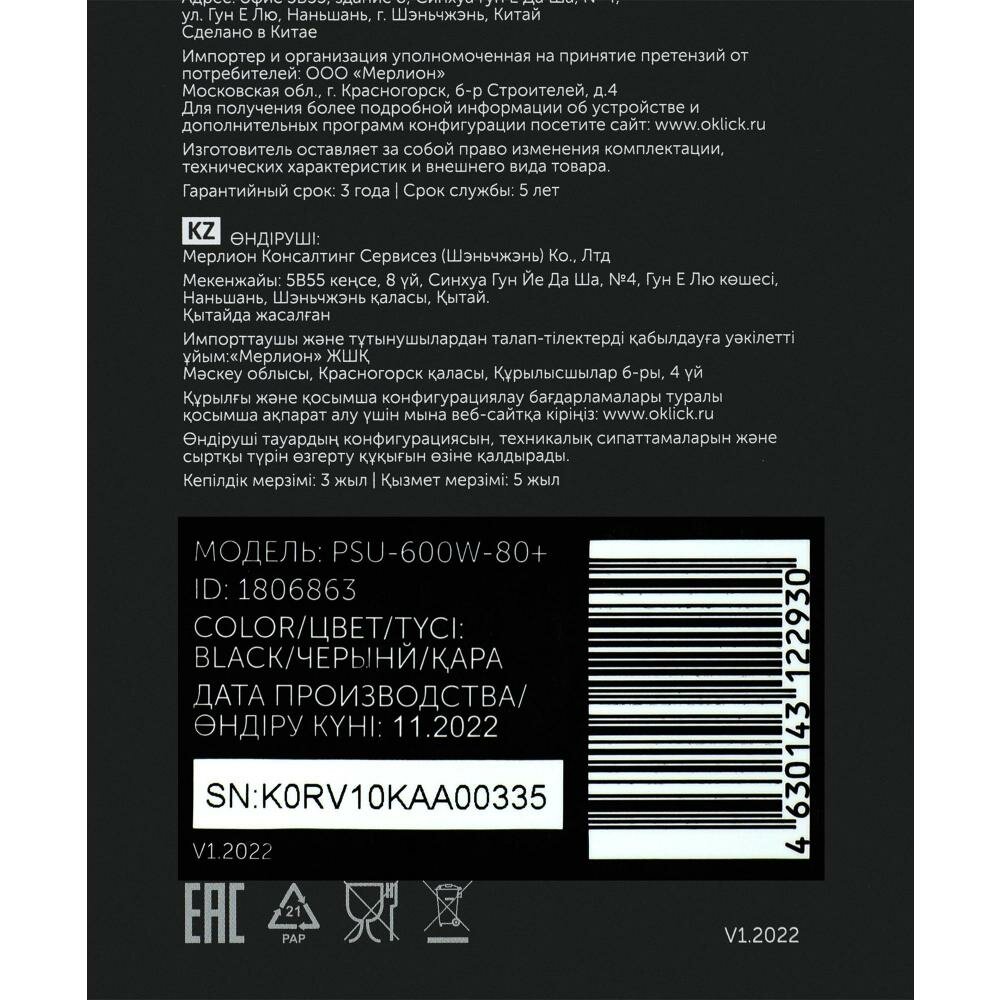 Блок питания Оклик ATX 600W GMNG PSU-600W-80+ 80 PLUS WHITE (24+4+4pin) APFC 120mm fan 6xSATA RTL