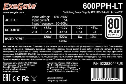 Блок питания ExeGate 80+ 600PPH-LT 600 Вт [atx vATX 12V 2.4, Apfc, 120 x 120 мм][EX282044RUS-OEM]