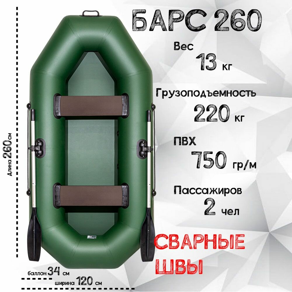 Лодка пвх под мотор Барс 2600, двухместная, сварные швы, зеленый