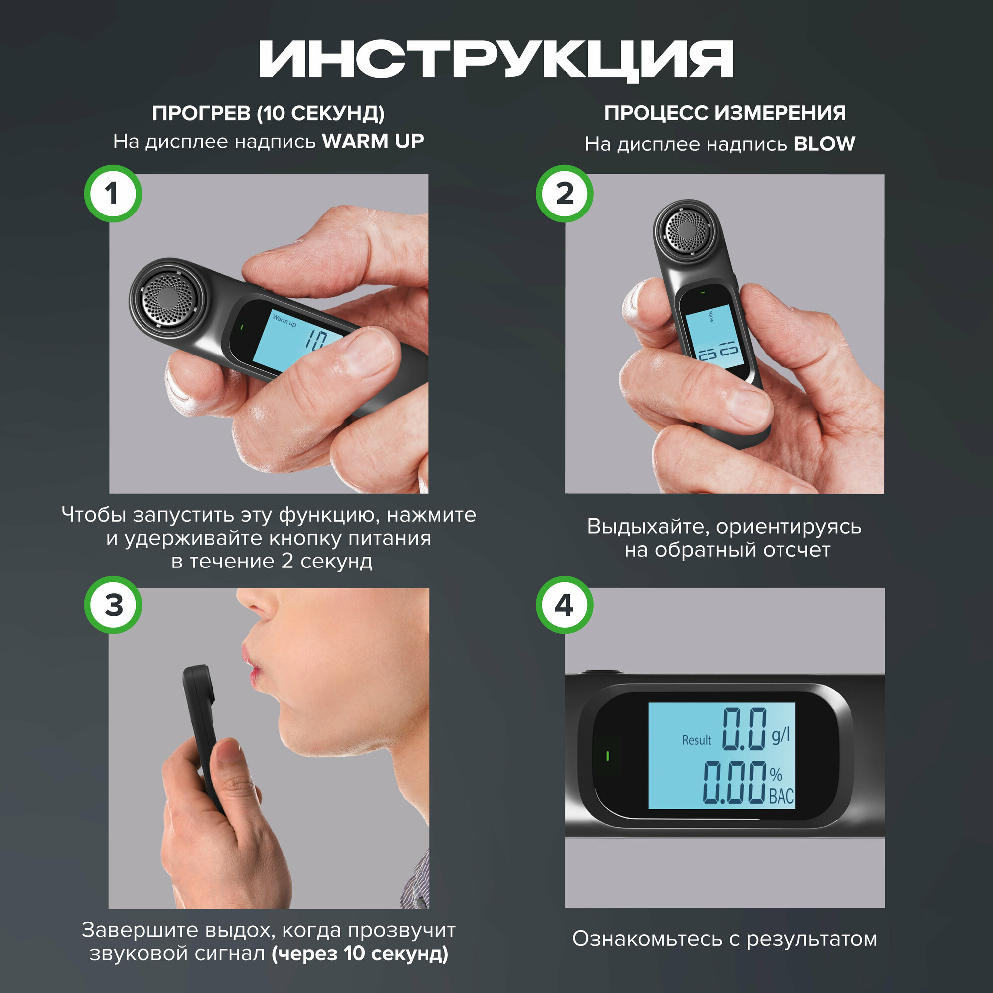 Первые 10 сек это он анализирует воздух и на вторые 10 сек нужно выдыхать