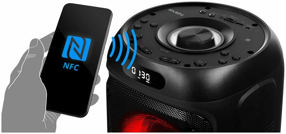 Мобильные колонки SVEN PS-770 2.0 чёрные (2x50W, mini Jack, USB, Bluetooth, FM, micro SD, NFC, LED-дисплей, ПДУ, 4400 мA, LED подсветка)