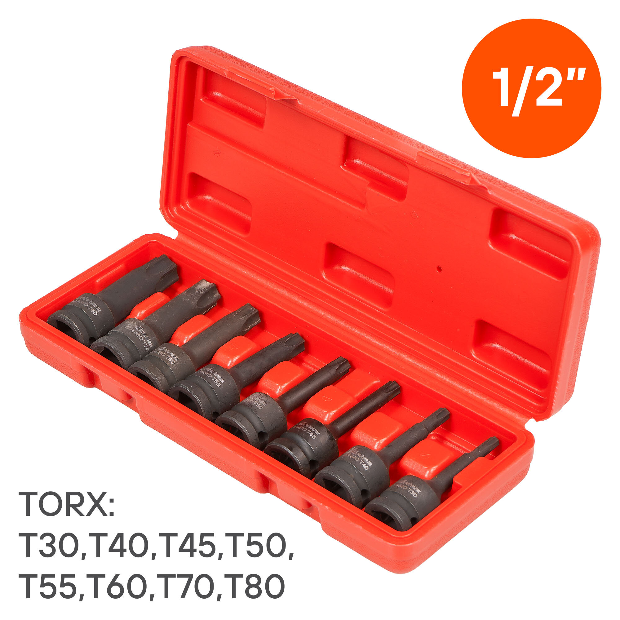 Airline Набор головок ударн. 1/2" 78мм внешний TORX 8 пр. (T30,T40,T45,T50,T55,T60,T70,T80) пласт. кейс ATAS050