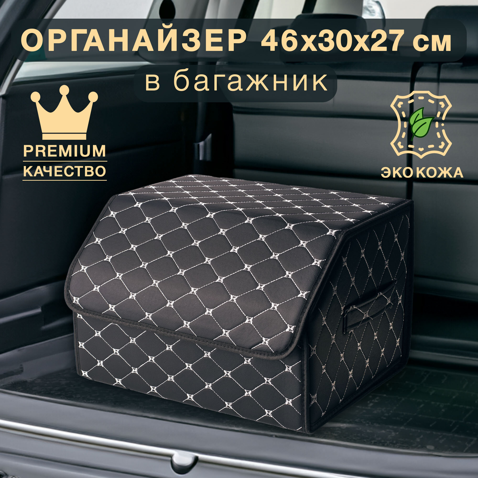 Саквояж в багажник автомобильный эко кожа черная синий ромб, объем 45 л