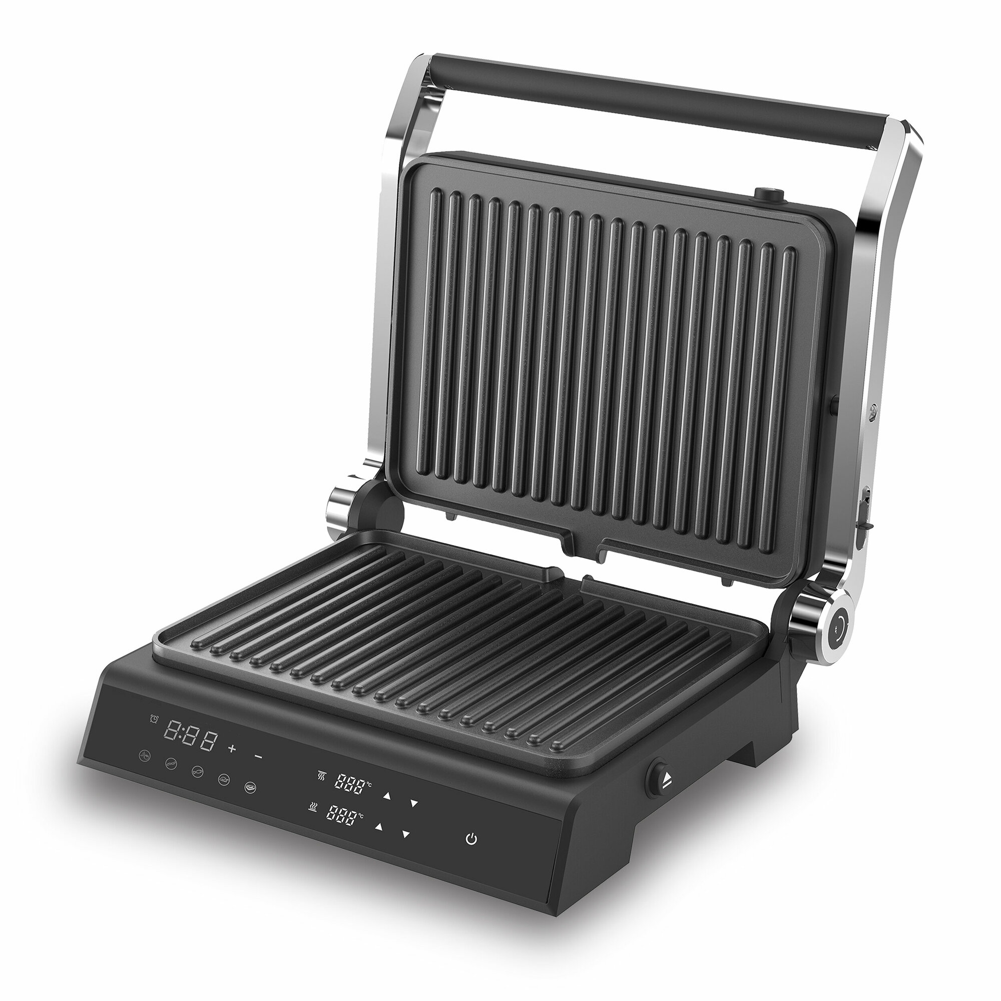| Особенности | антипригарное покрытие / крышка / поддон для сбора жира / регулировка высоты верхней панели / съемные пластины / можно мыть в посудомоечной машине / сенсорное управление |