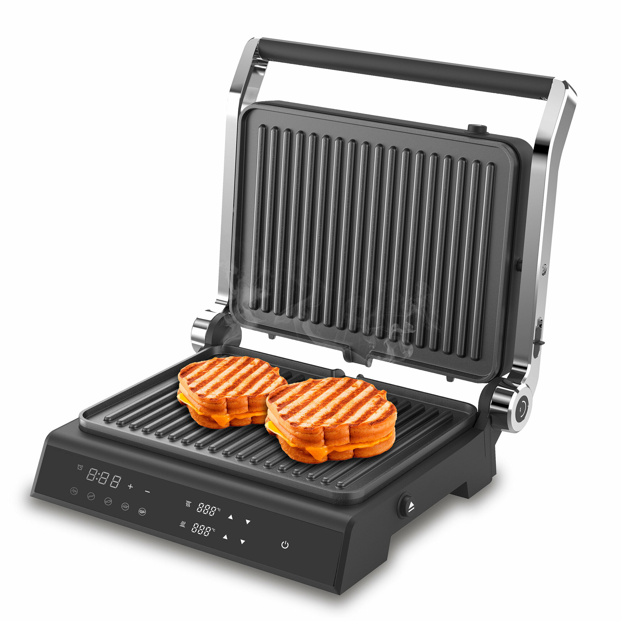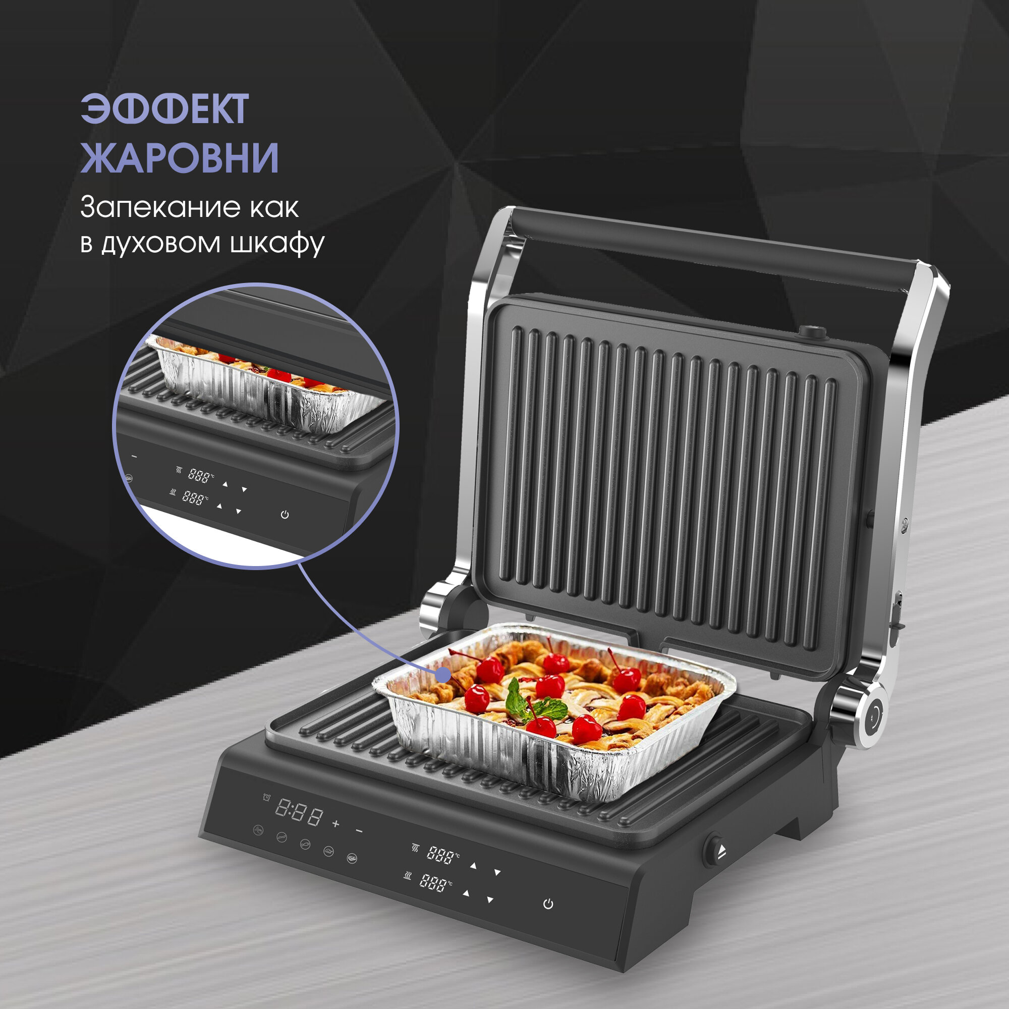 | Дополнительная информация | 4 в 1: гриль/барбекю/запекание/сэндвич-тостер, авторегулировка высоты верхней панели, 5 автоматических программ + ручной режим |