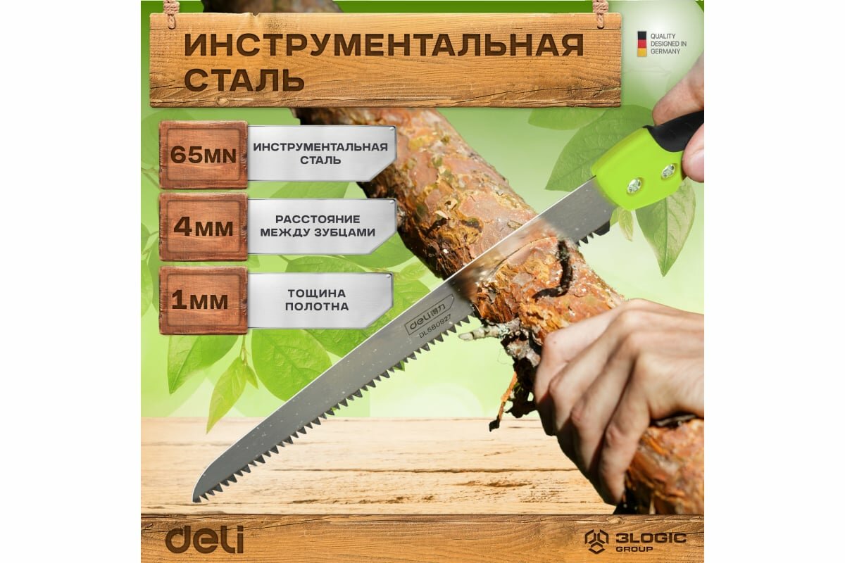 Садовая пила с ножнами DELI DL580927 270 мм, сталь 65MN, 7 зубьев на дюйм, обрезиненная ручка, 3D заточка, двухрядное распределение кромок 114779