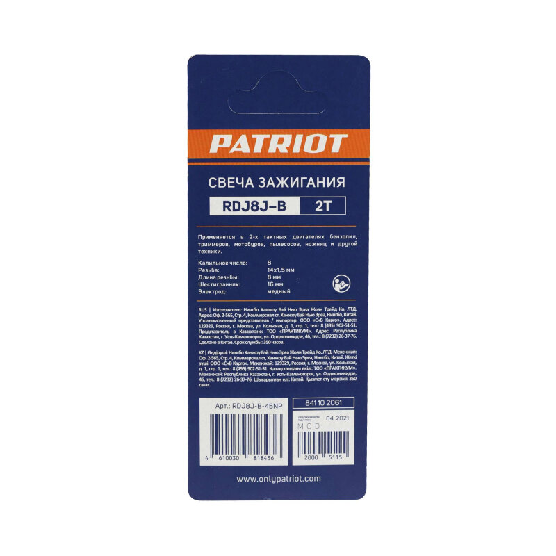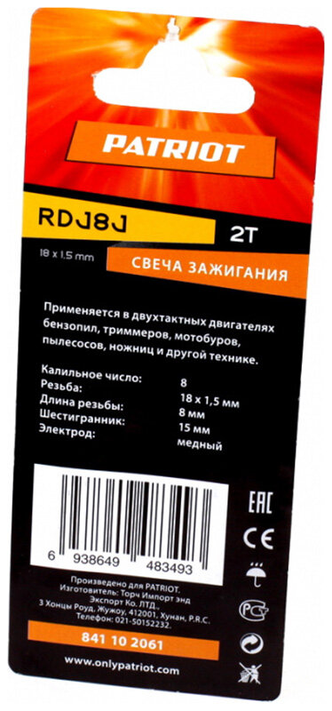 Свеча зажигания Patriot RDJ8J-B, для двухтактных двигателей, 1 шт