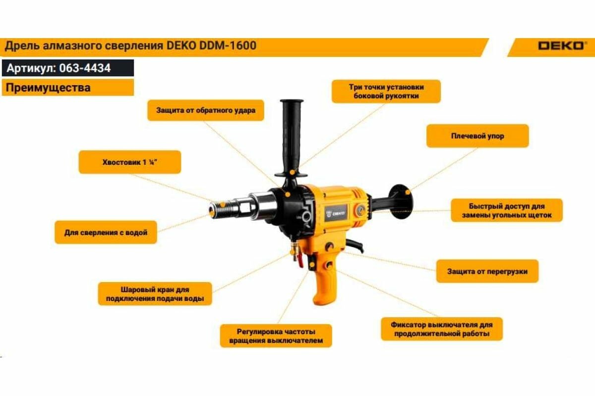 Купить DEKO Дрель алмазного сверления DDM-1600, 1600 Вт, Макс. Диаметр - 140 мм 063-4434