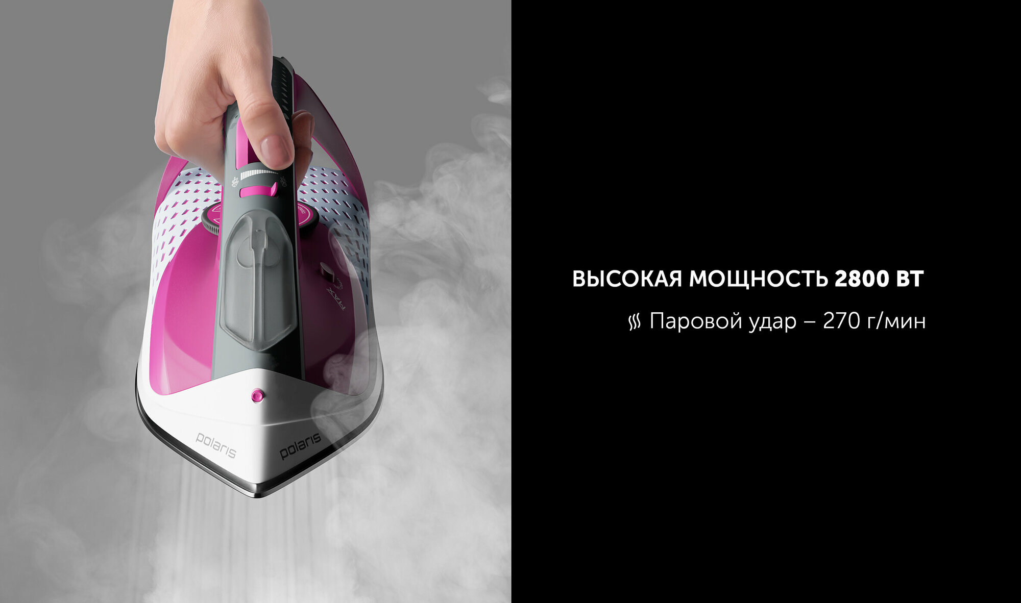 Утюг Polaris PIR 2860AK 3m для одежды с керамическим покрытием, мощный паровой удар 270 г/мин, черный/розовый