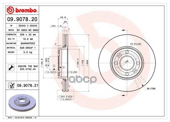 BREMBO 09.9078.20 (09907820 / 402061200R / 402067016R) диск торм. пер. вент.[258x22] 4 отв. (Комплект 2 штуки)