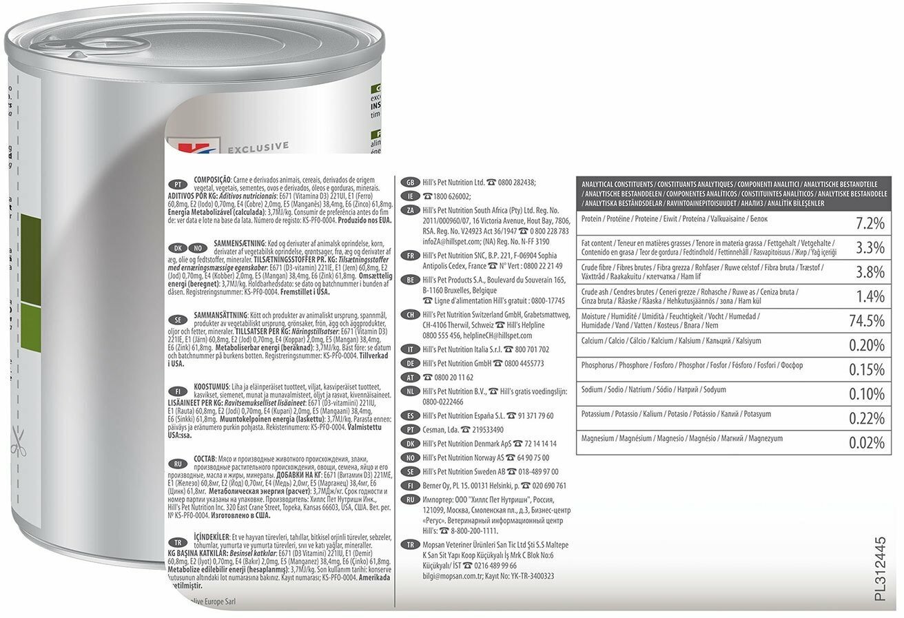 | Дозировка | для снижения веса (банка 370 г): - вес собаки 2,5 кг - 2/5 - вес собаки 5 кг - 3/4 - вес собаки 10 кг - 1 1/4 - вес собаки 20 кг - 2 - вес собаки 30 кг - 2 3/4 - вес собаки 40 кг - 3 - вес собаки 50 кг - 3 1/2 - вес собаки 60+ кг - 3/4 на 10 кг; для поддержания веса (банка 370 г): - вес собаки 2,5 кг - 2/3 - вес собаки 5 кг - 1 1/4 - вес собаки 10 кг - 2 - вес собаки 20 кг - 3 1/4 - вес собаки 30 кг - 4 1/3 - вес собаки 40 кг - 5 1/2 - вес собаки 50 кг - 6 1/2 - вес собаки 60+ кг - 1 1/5 на 10 кг |