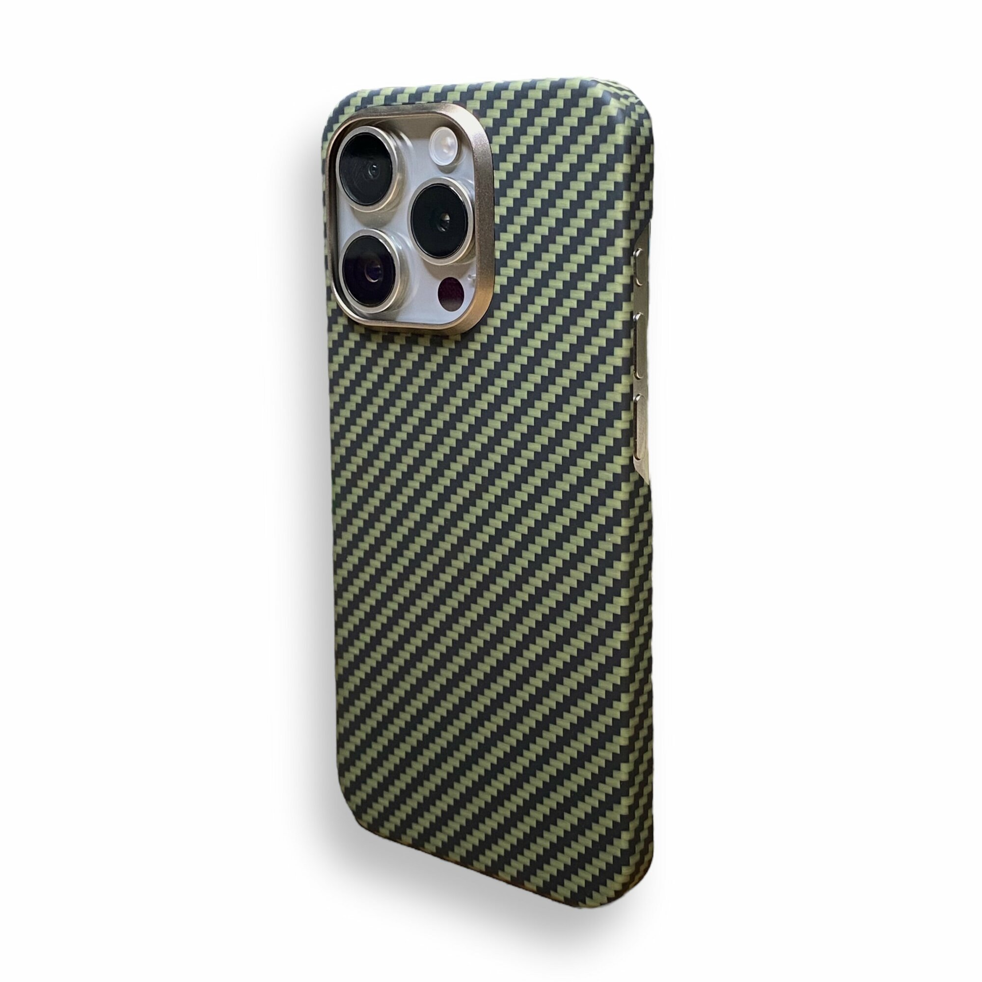 Чехол карбоновый для iPhone 15 pro Max (MagSafe) Кевларовый из арамидного волокна, ультратонкий, сверхпрочный. Золотой/Черный
