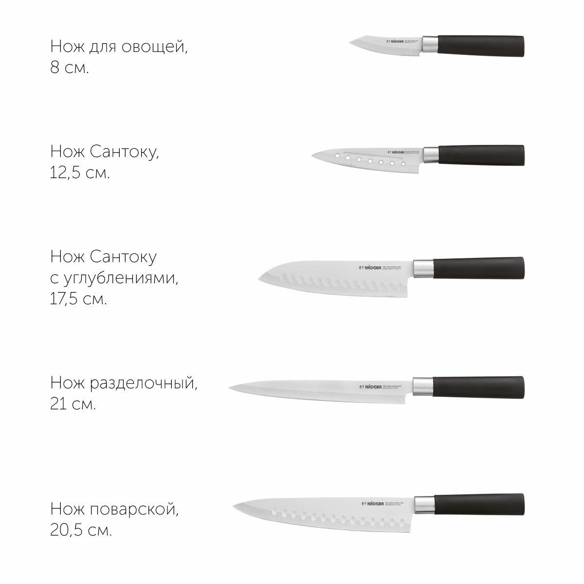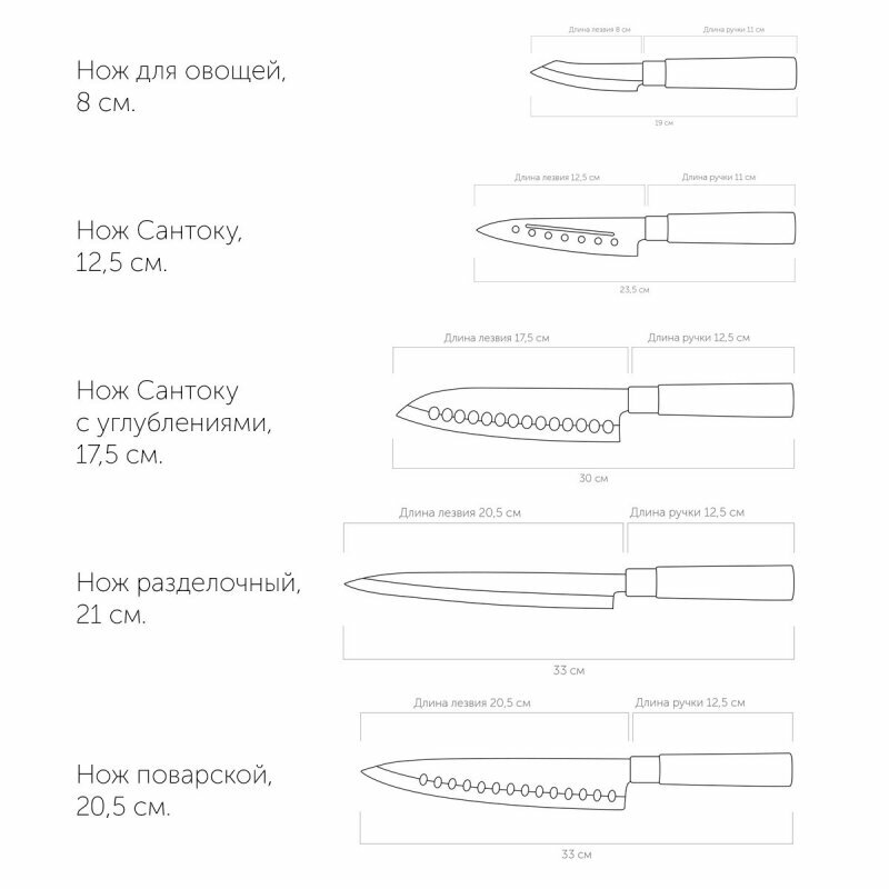 | Типы ножей в наборе | нож для овощей, нож сантоку, разделочный нож, универсальный нож, шеф-нож |