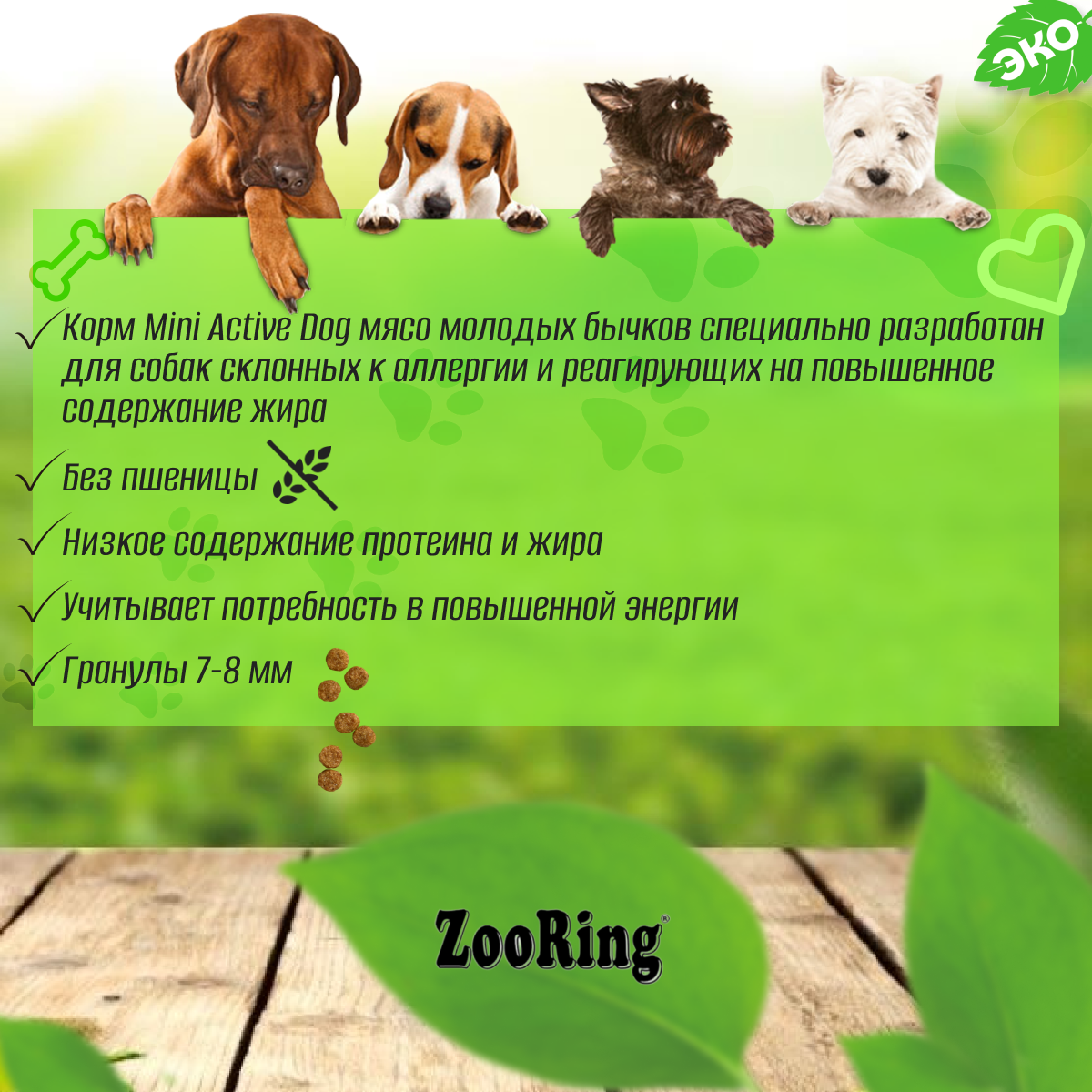 ZooRing Корм сухой для собак Mini Active Dog Мясо молодых бычков, 10кг