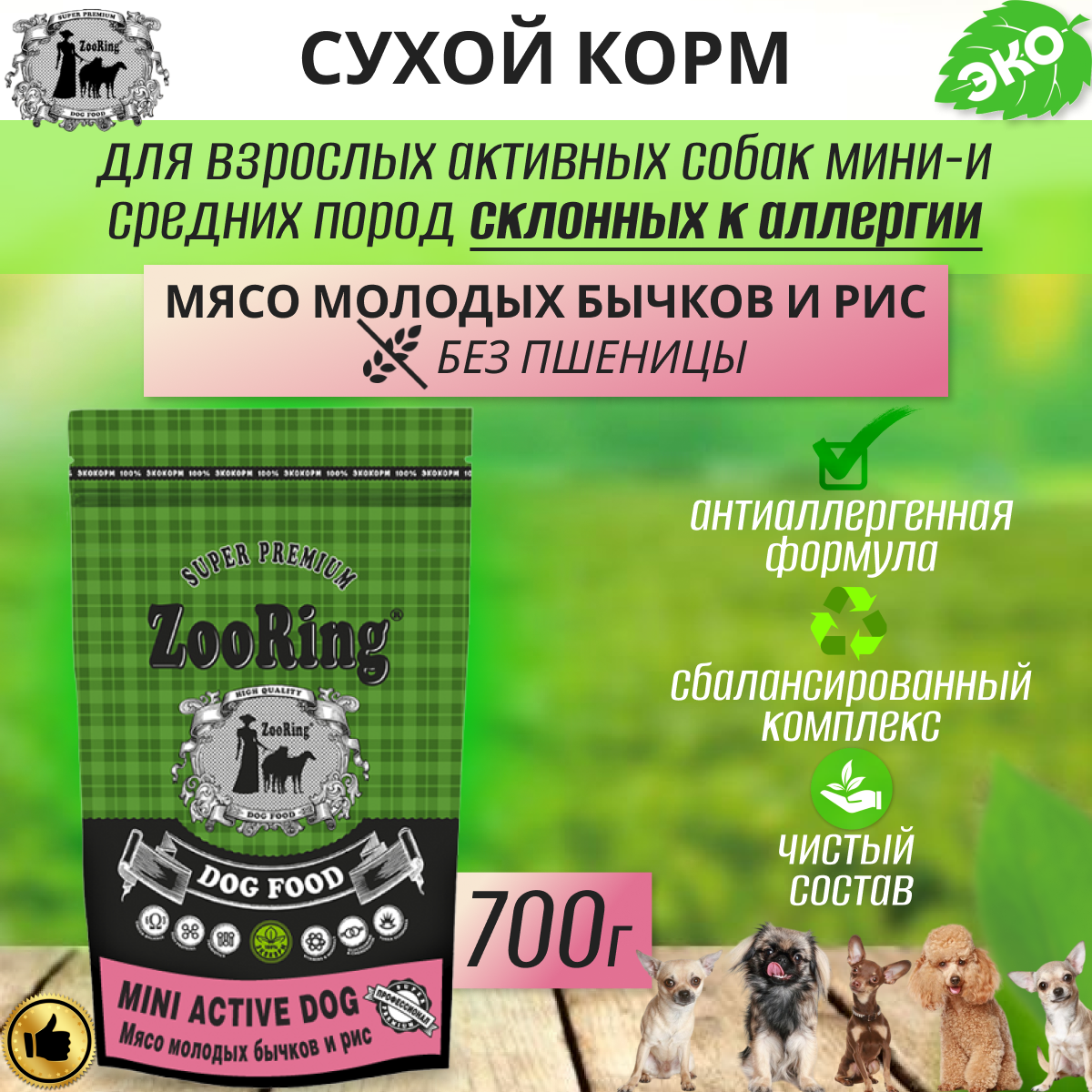 Сухой корм ZooRing Mini Active Dog 24/12 мясо молодых бычков и рис для собак мелких пород, 0,7кг