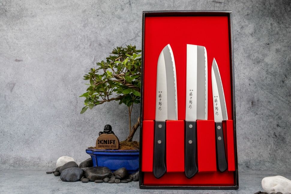 | Комплектация | нож универсальный 13,5 см, нож для овощей накири 16 см, нож сантоку 16,5 см |