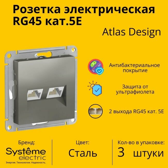 Купить Розетка компьютерная 2-м AtlasDesign RJ45 кат.5E механизм сталь ATN000985 Schneider Electric (3шт.)