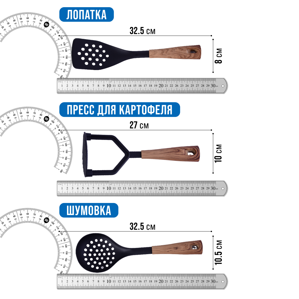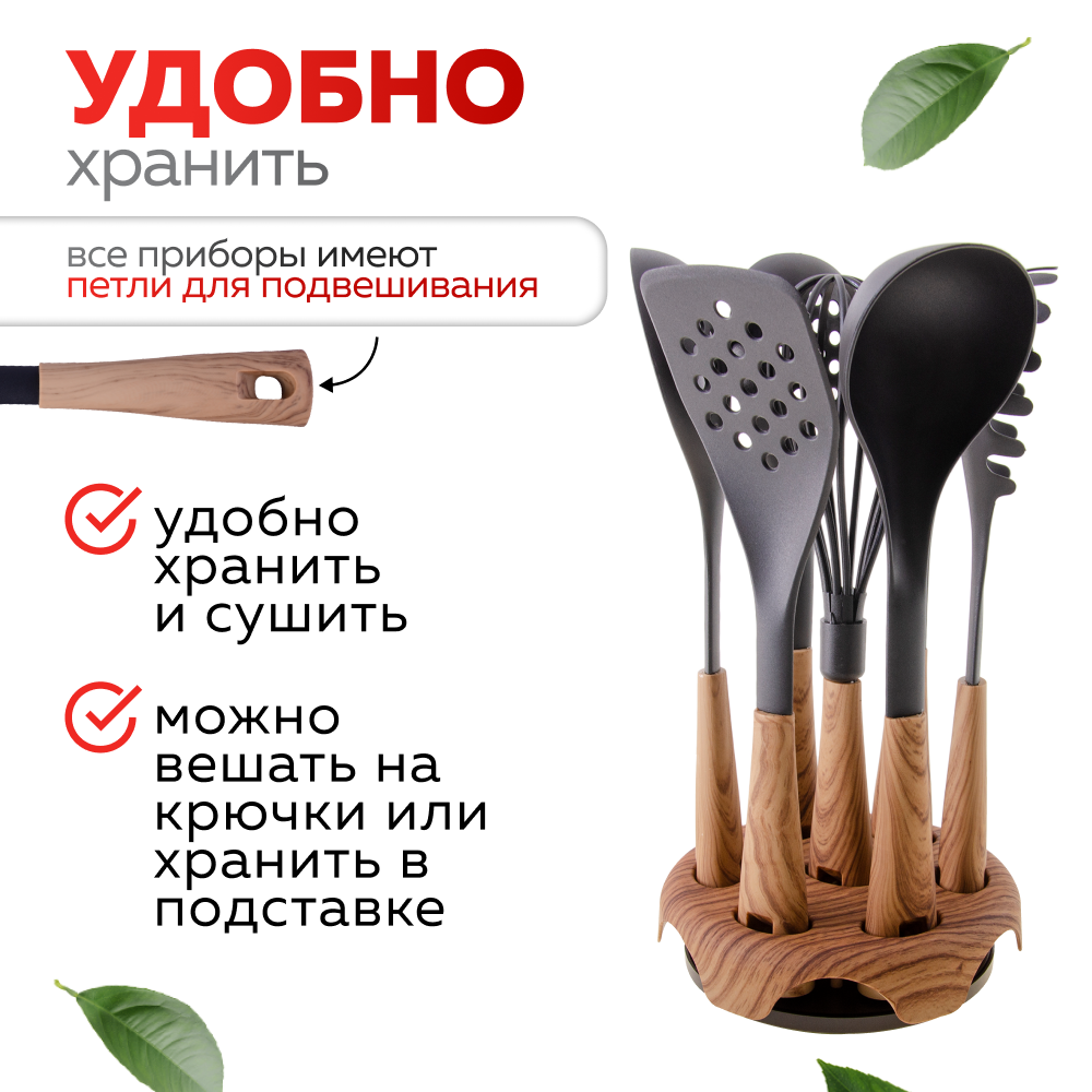 | Состав набора | венчик / картофелемялка / ложка для спагетти / лопатка / половник / шумовка |