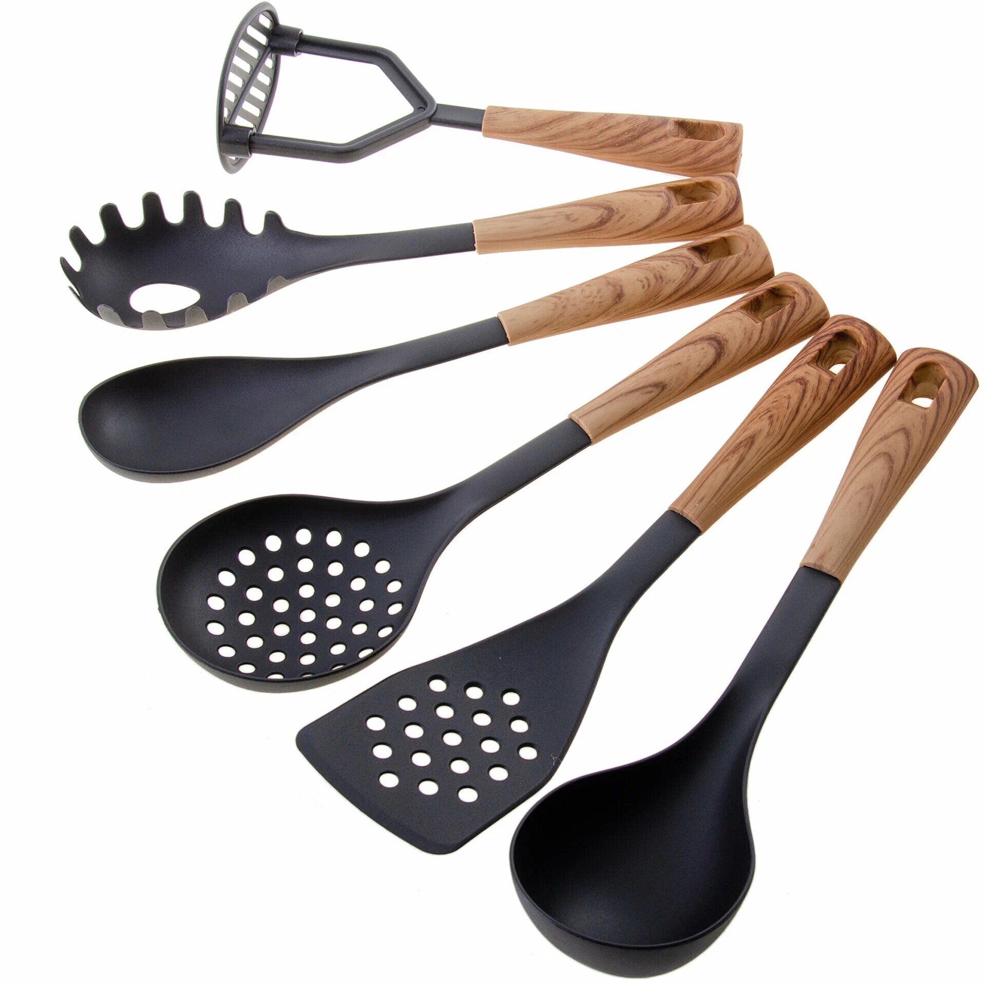 | Комплектация | половник, ложка для спагетти, сервировочная ложка, лопатка с прорезями, картофелемялка, шумовка, подставка |