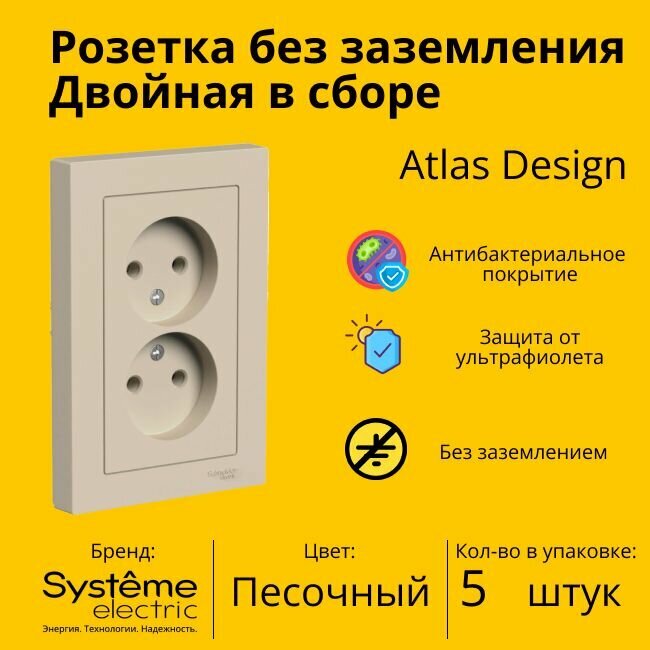 Купить Розетка электрическая двухместная Systeme Electric Atlas Design без заземления в сборе 16А, Песочный - 5 шт.