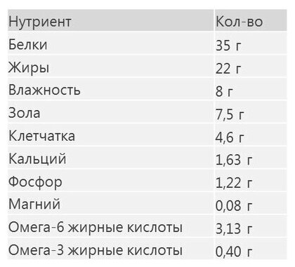 | Пищевая ценность | белки - 35 г, жиры - 22 г, омега-6 жирные кислоты - 3,13 г, омега-3 жирные кислоты - 0,4 г, влажность - 8 г, зола - 7,5 г, клетчатка - 4,6 г |