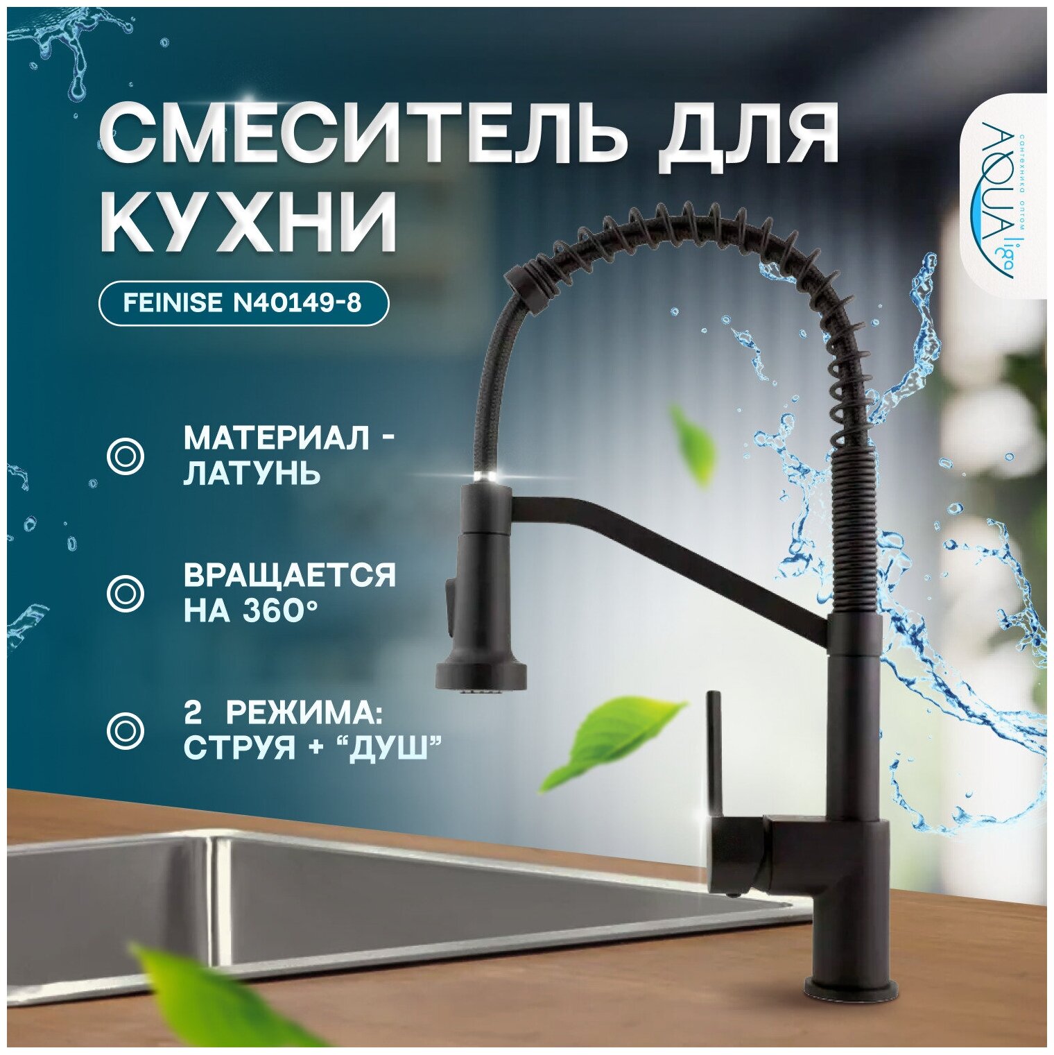 Смеситель для кухни однорычажный Feinise высокий нос с выдвижной лейкой на гайке, черный, латунь N40149-8