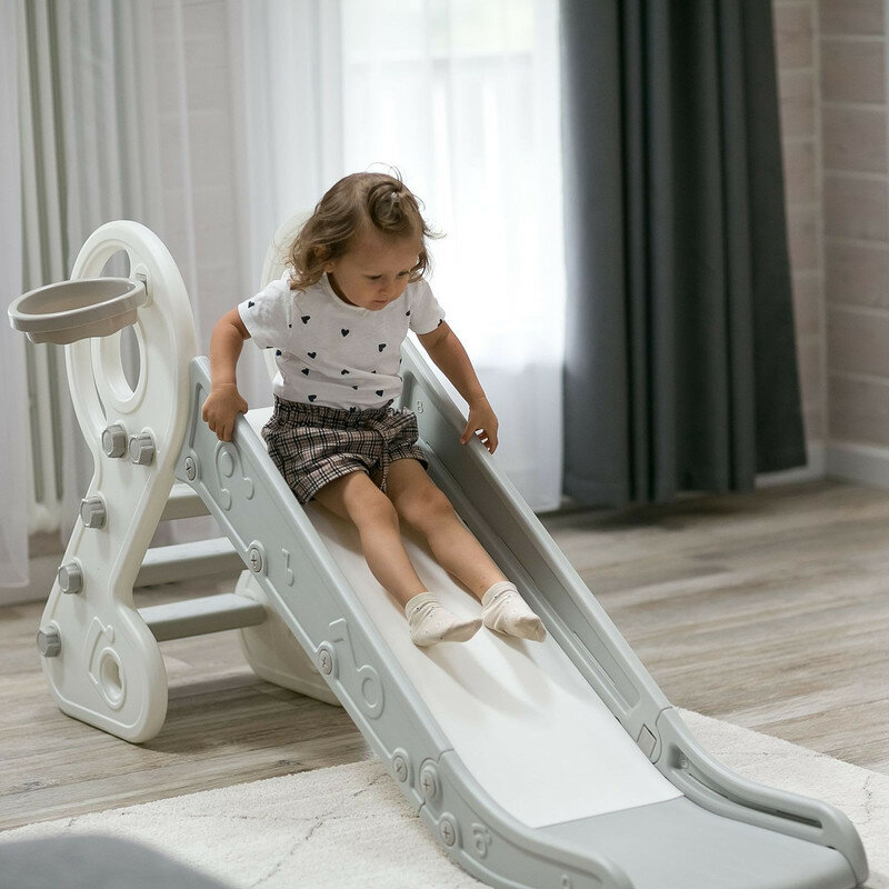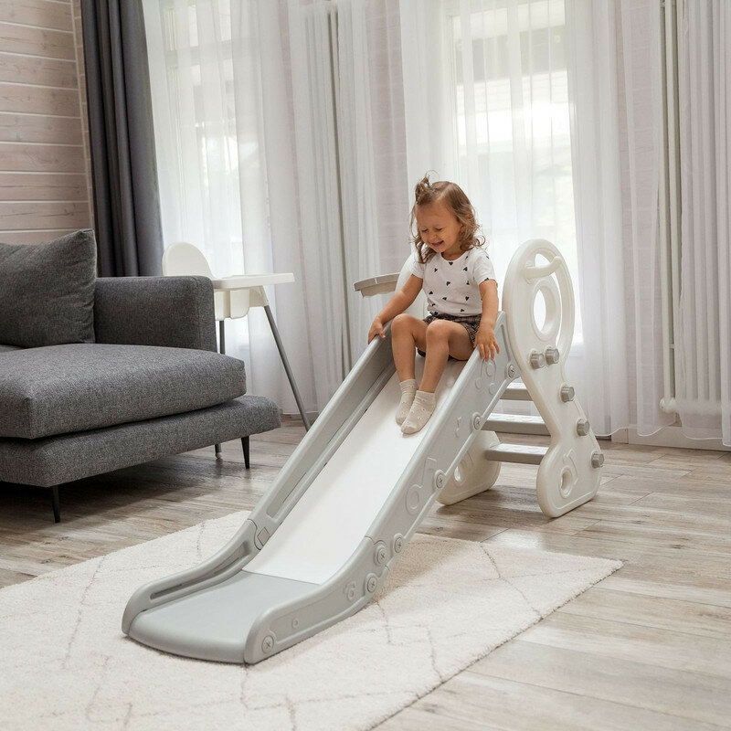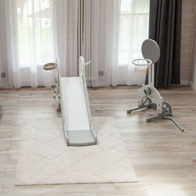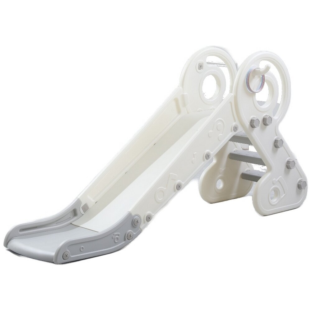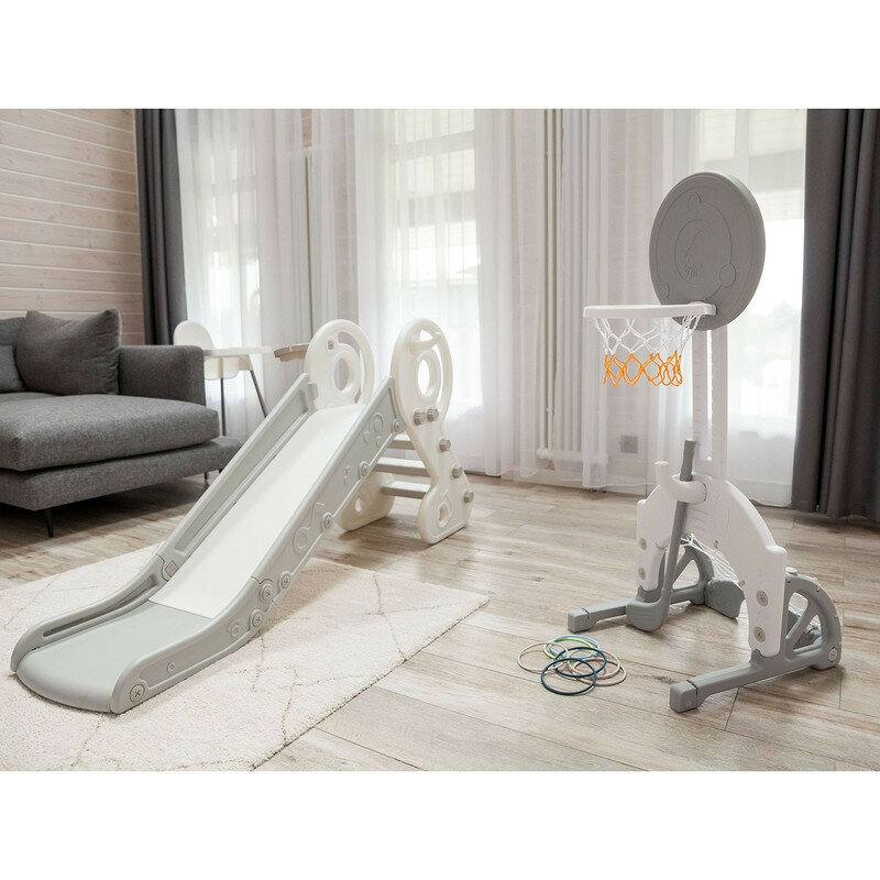 Горка детская UNIX Kids Music Grey, со спуском 136 см, из пластика, с баскетбольным кольцом, серый, белый
