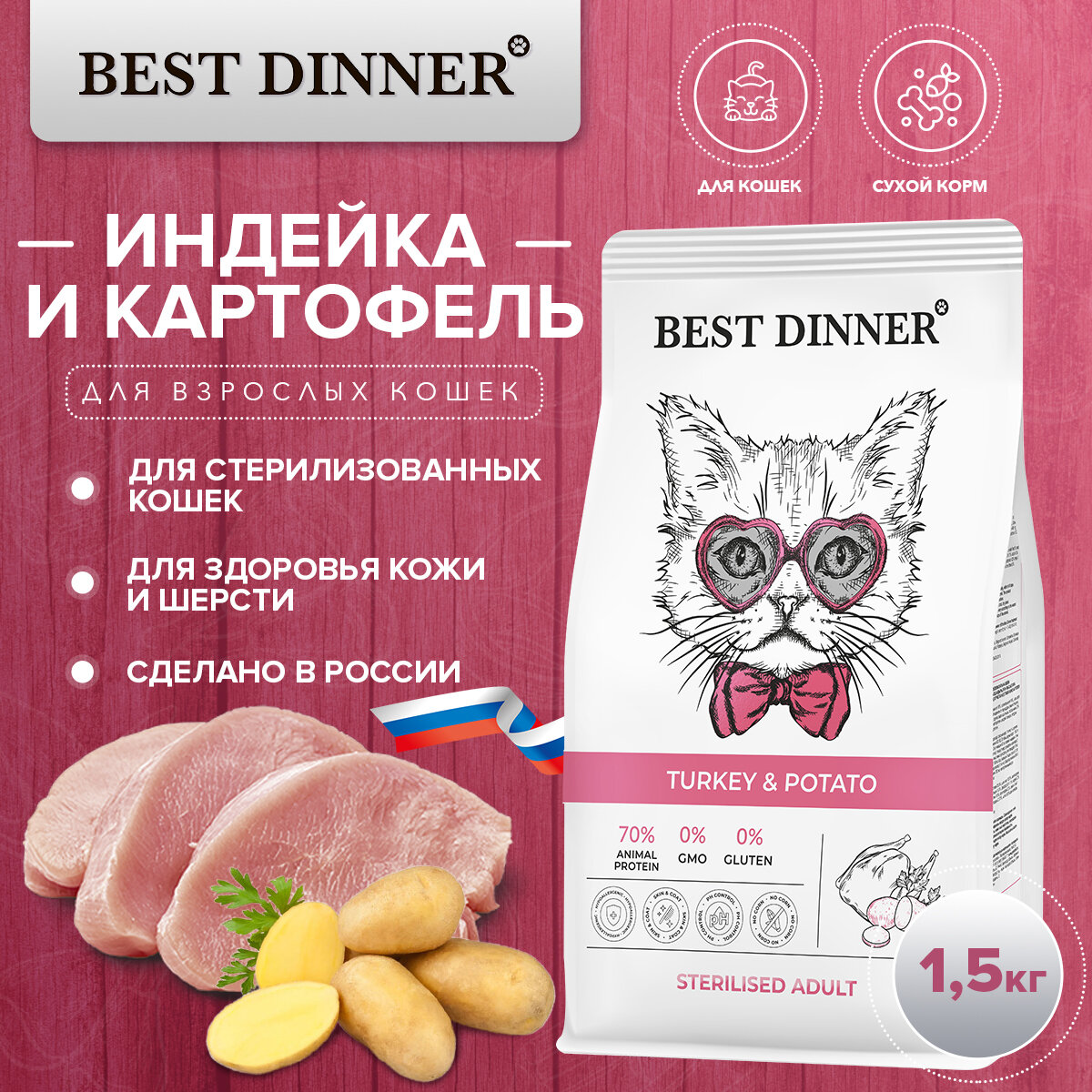 Корм сухой для стерилизованных кошек супер премиум класса с индейкой и картошкой при чувствительном пищеварении и аллергии 1,5кг Best Dinner (Бест Диннер)