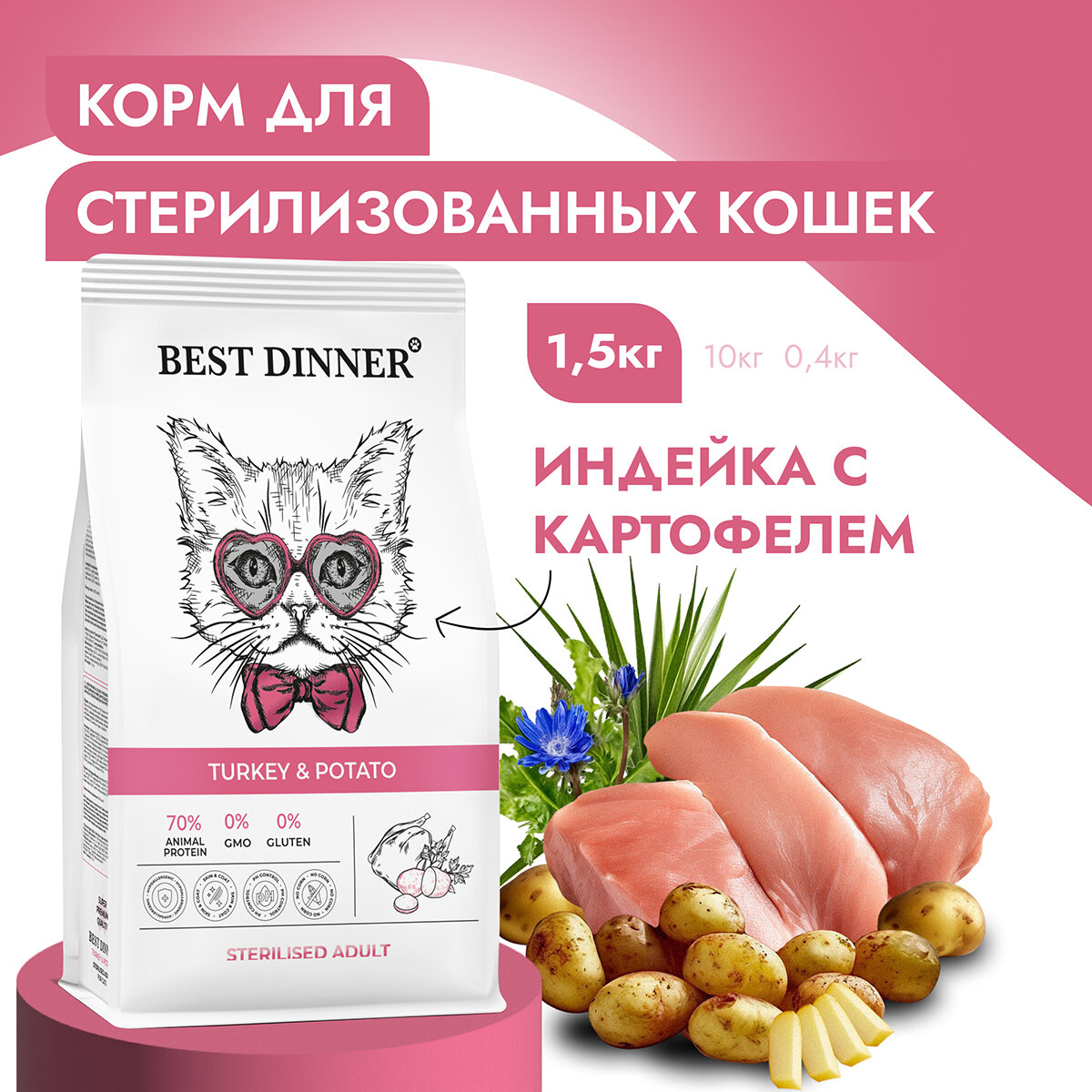 BEST DINNER CAT ADULT STERILISED TURKEY & POTATO для взрослых кастрированных котов и стерилизованных кошек с чувствительным пищеварением с индейкой и картофелем (0,4 кг)