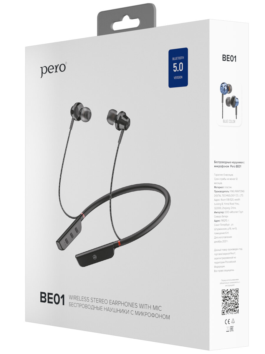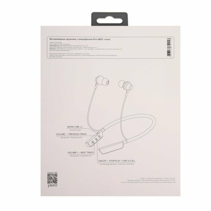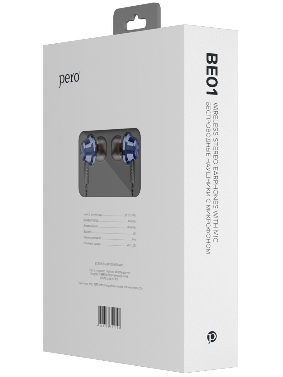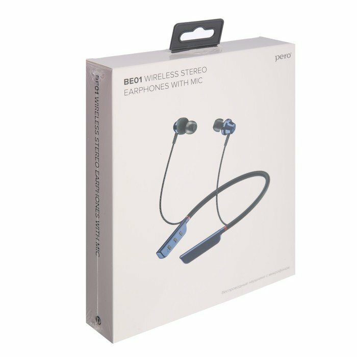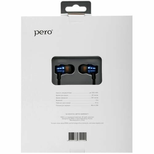 PERO Наушники PERO BE01, беспроводные, BT 5.0, микрофон, 250 мАч, до 30 часов, синие