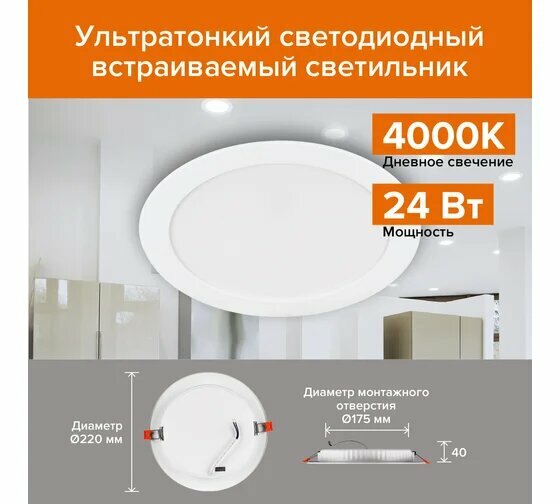 Встраиваемый светильник Wolta св-к св/д даунлайт DLUS ультратонкий встр. 24W(1800lm) 4000K 4K IP20 225x35 метал DLUS-24W-4K, 1 шт.