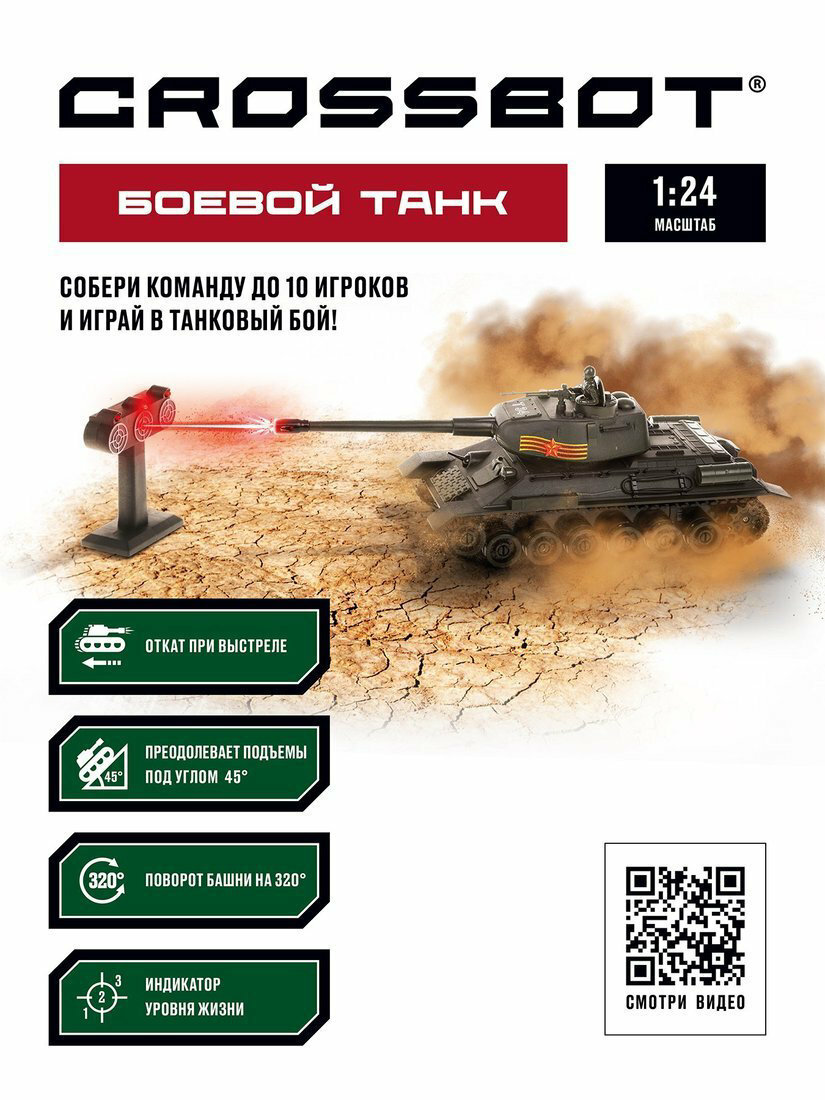 Машина На Радиоуправлении Crossbot 1:24 Танк Т-34 (звук, пульт, инфракрасная пушка, аккумулятор, USB, мишень с индикаторами попадания, мина, в коробке, от 4 лет) 870630, (Guangdong Jaki Technology and Education Co, Ltd.)