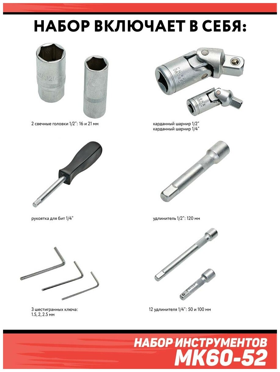 | Головки торцевые подробно | 1/4": 4, 4.5, 5, 5.5, 6, 7, 8, 9, 10, 11, 12, 13, 14 мм; 1/2": 10, 11, 12, 13, 14, 15, 16, 17, 18, 19, 20, 21, 22, 23, 24, 27, 30, 32 мм; свечные 1/2": 16, 21 мм; удлинитель 1/2": 125, 250 мм; удлинитель 1/4": 50, 100 мм; карданный шарнир 1/4", 1/2"; вороток т-образный 1/2", 1/4"; гибкий удлинитель 1/4": 150 мм; трещотка 1/2", 1/4" |