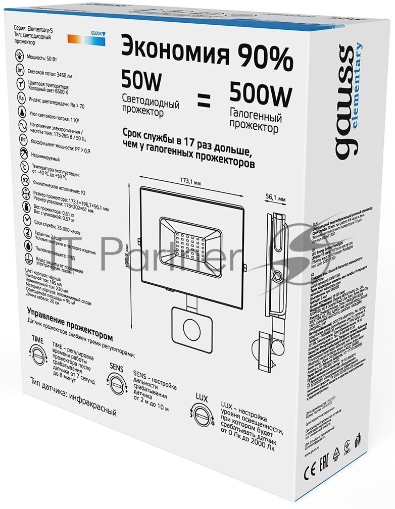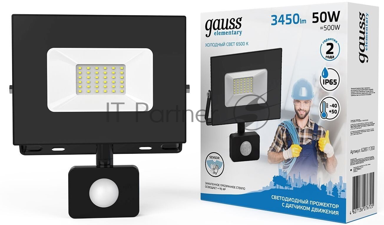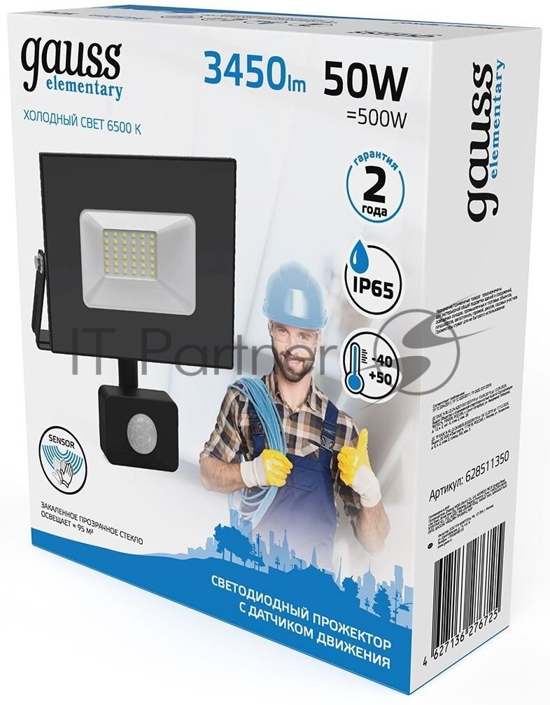 Прожектор светодиодный Elementary 50Вт 3500лм IP65 6500К с датчиком движения Gauss 628511350 интересное: