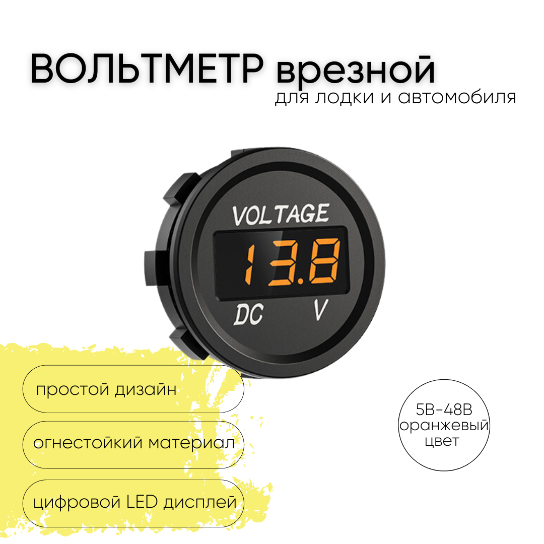 Купить Вольтметр с экраном влагозащитный врезной для лодок и авто, Контроль напряжения аккумулятора 5-48В, подсветка оранжевая