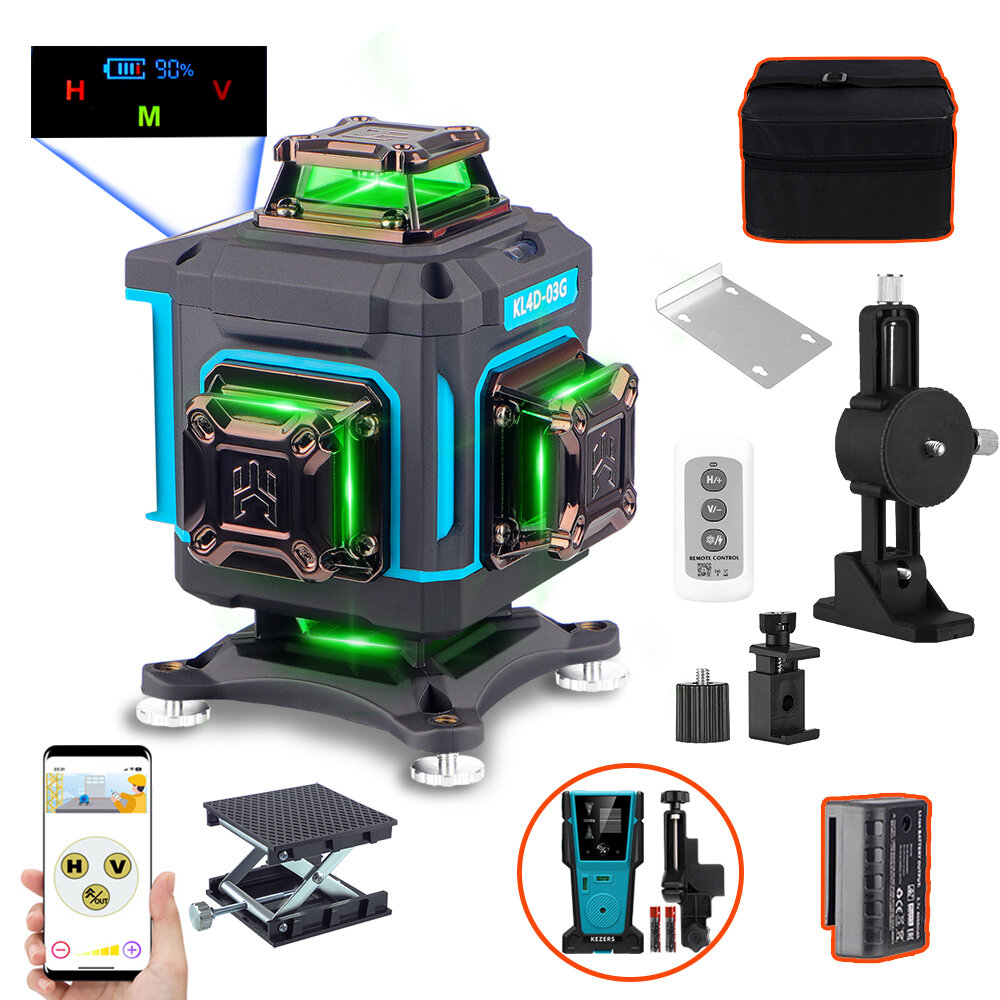 Лазерный уровень Kezzers KL4D-03G, Зеленый луч 360 4D 16 Линий, С 2-мя литиевыми батареями емкостью 4000 мАч,нейлоновая сумка, С приемником KL-1D