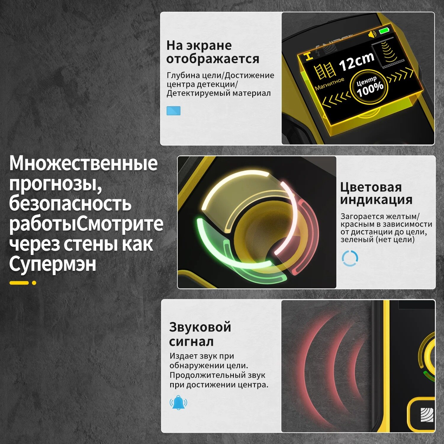 | Обнаруживаемые материалы | деревянные конструкции, цветные металлы, черные металлы, электропроводка |
